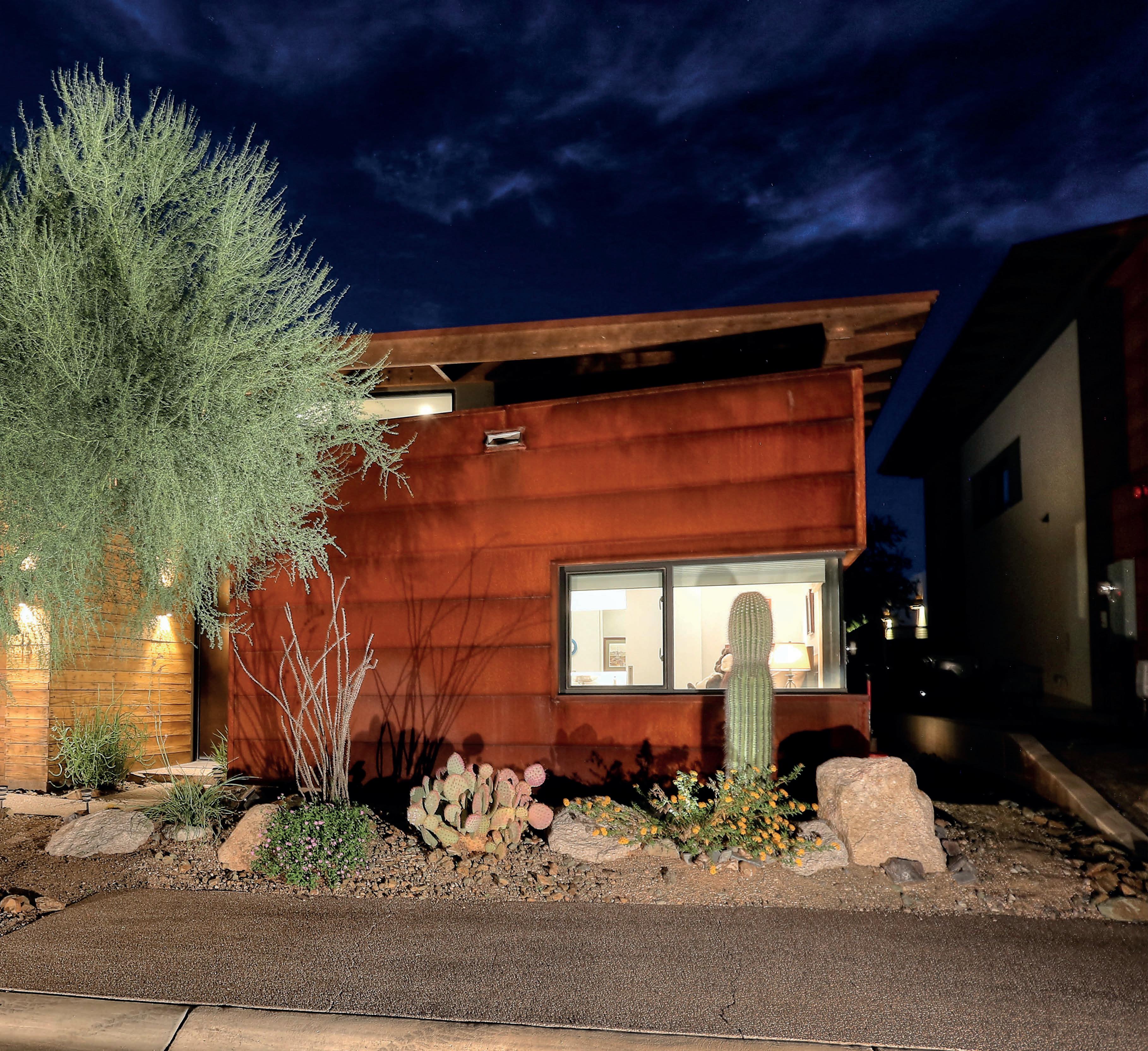 Rustic Contemporary at the Heart of Cave Creeks desired entertainment area. One of the original builds using super insulated 8’’ thick foam walls (R40) and 12’’ thick ceilings (R60) coated with GFRC. Imagine living inside an ice chest, cool and quiet. A 10’ custom door at the entry opens into an expansive Great Room with 14’ to 17’ high ceilings, gas fireplace, and clearstory windows. The Kitchen has Bosch appliances, 9’ island and custom cabinetry. Two large bedrooms and a Den, two luxurious baths plus a powder room. All Commercial grade, Low-E tinted glass in windows and doors. Come and enjoy your back patio with both sunny and shady sitting areas, fountains, gardens, gas firepit, and custom BBQ island with views of the hillside to the North. The Community Pool could not be closer! This home comes with a two car garage with 8’ high garage door and 10’ ceilings. The slab in front will accommodate two additional cars for your guests. Interior walls are also smooth coated with GFRC for structural integrity.