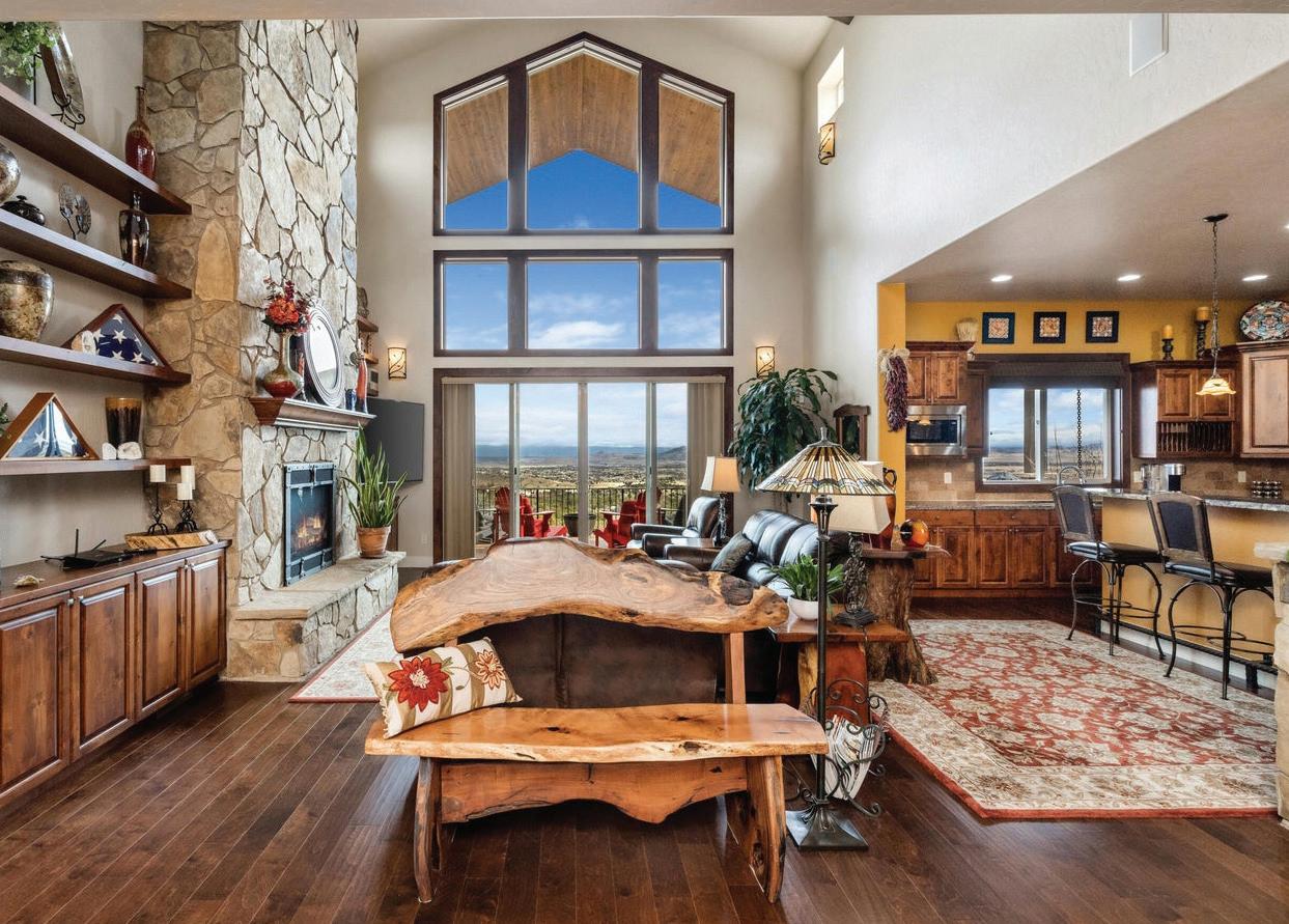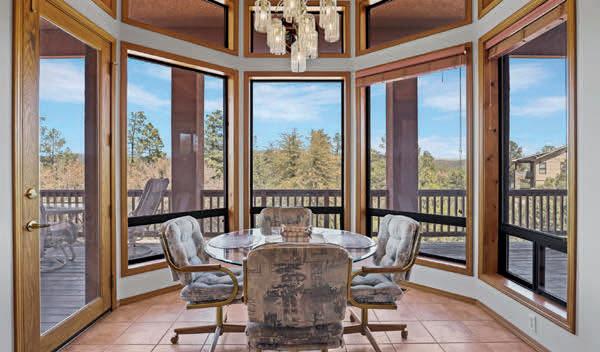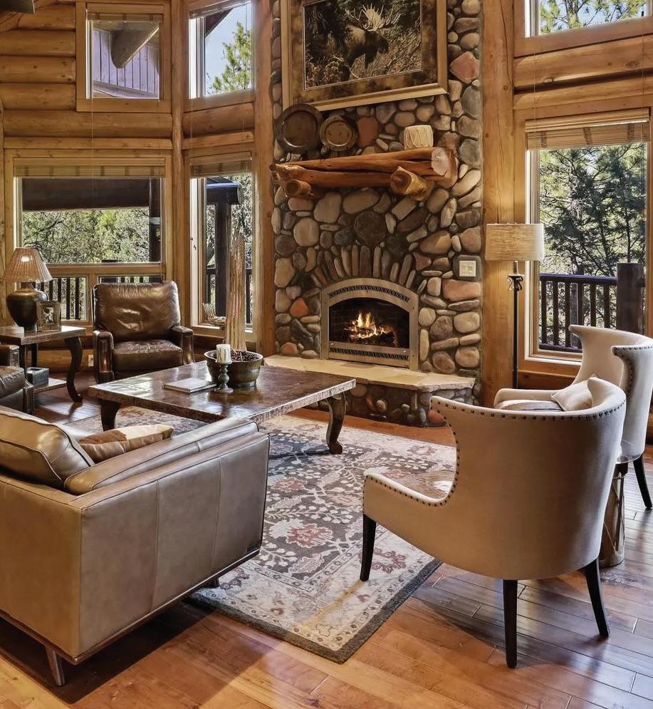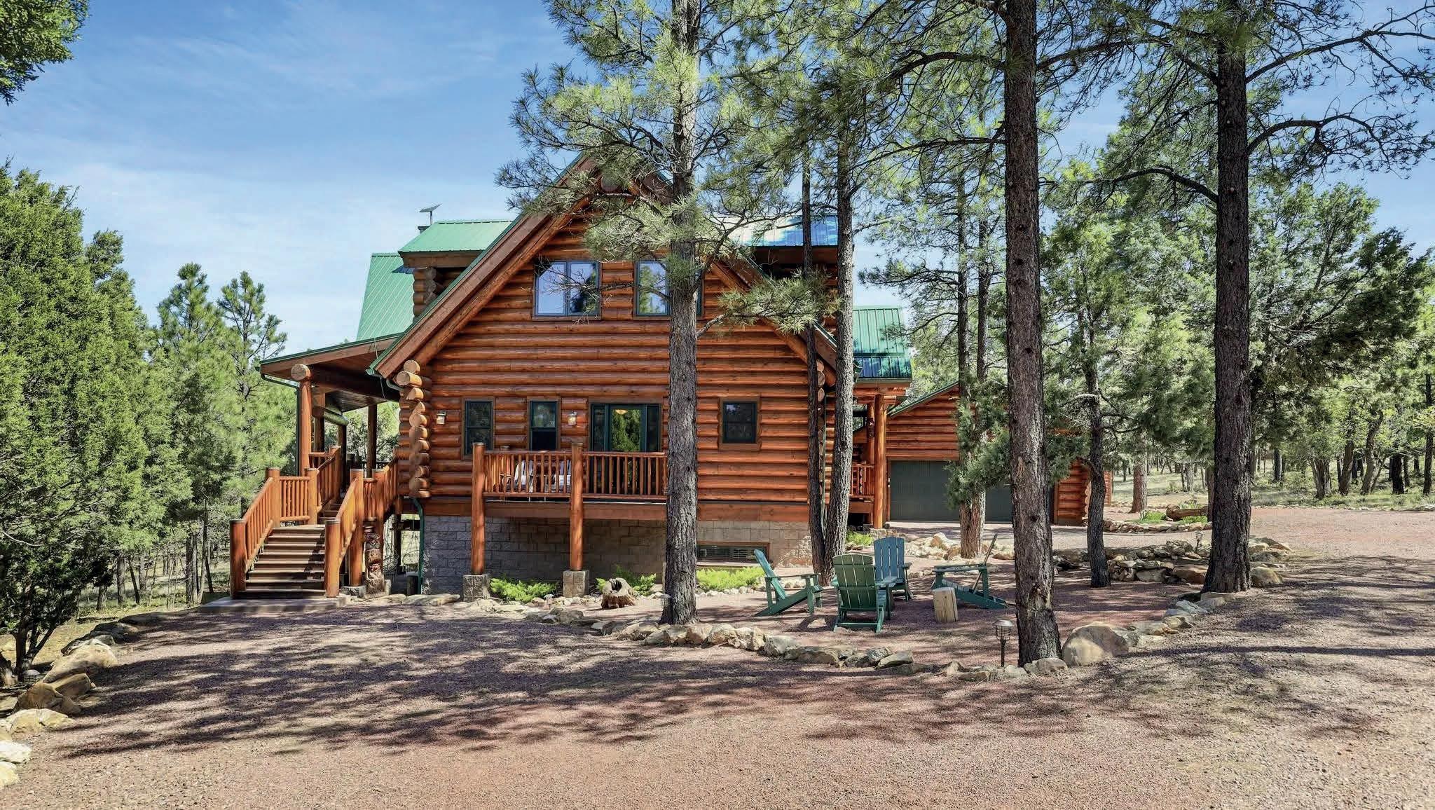 This expertly handcrafted log cabin was built with only the finest fixtures and finishes and sits in the forest on a large lot full of towering ponderosa pines!! The inside features an open floor plan with vaulted tongue and groove ceilings with log rafters along with wood and stone features throughout. Expansive windows give a bright and airy feel to the open concept great room which features a gigantic custom stone fireplace. The well-appointed gourmet kitchen features a custom center island made of juniper wood with a breakfast bar for informal dining, ample counter and cabinet space, solid hickory cabinets, and a roomy walk-in pantry. The formal dining area is encased in windows and adorned with a rustic deer antler chandelier. The impressive main floor master suite features gorgeous log beams with access to a private deck to take in the cool mountain air. 5