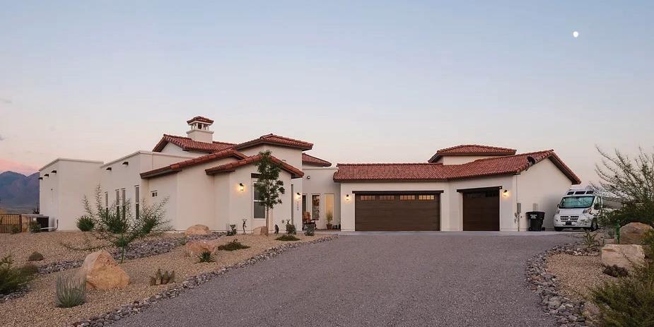 Don’t miss this stunning Mediterranean home. This home has it all, gorgeous exterior, with circular paver drive, beautifully landscaped with low voltage lighting, turf in the rear, a sparkling play pool with beach area and bar stools, a 30’ x 48’ detached garage with (2) 10’ x 12’ doors, exterior ramada, and extensive paver patios. Inside you will find a spectacular 3990 sq ft open concept floorplan, with 4 bedrooms 3 bathrooms, a large den (or could be a 5th bedroom), huge family room, beautiful fireplace sitting area and a entertainers delight kitchen and dining room. The spacious primary bedroom has a sliding door that leads to a private patio and the primary bath has a large shower with rain shower head and a jetted tub with a door that leads out to the rear patio and backyard.