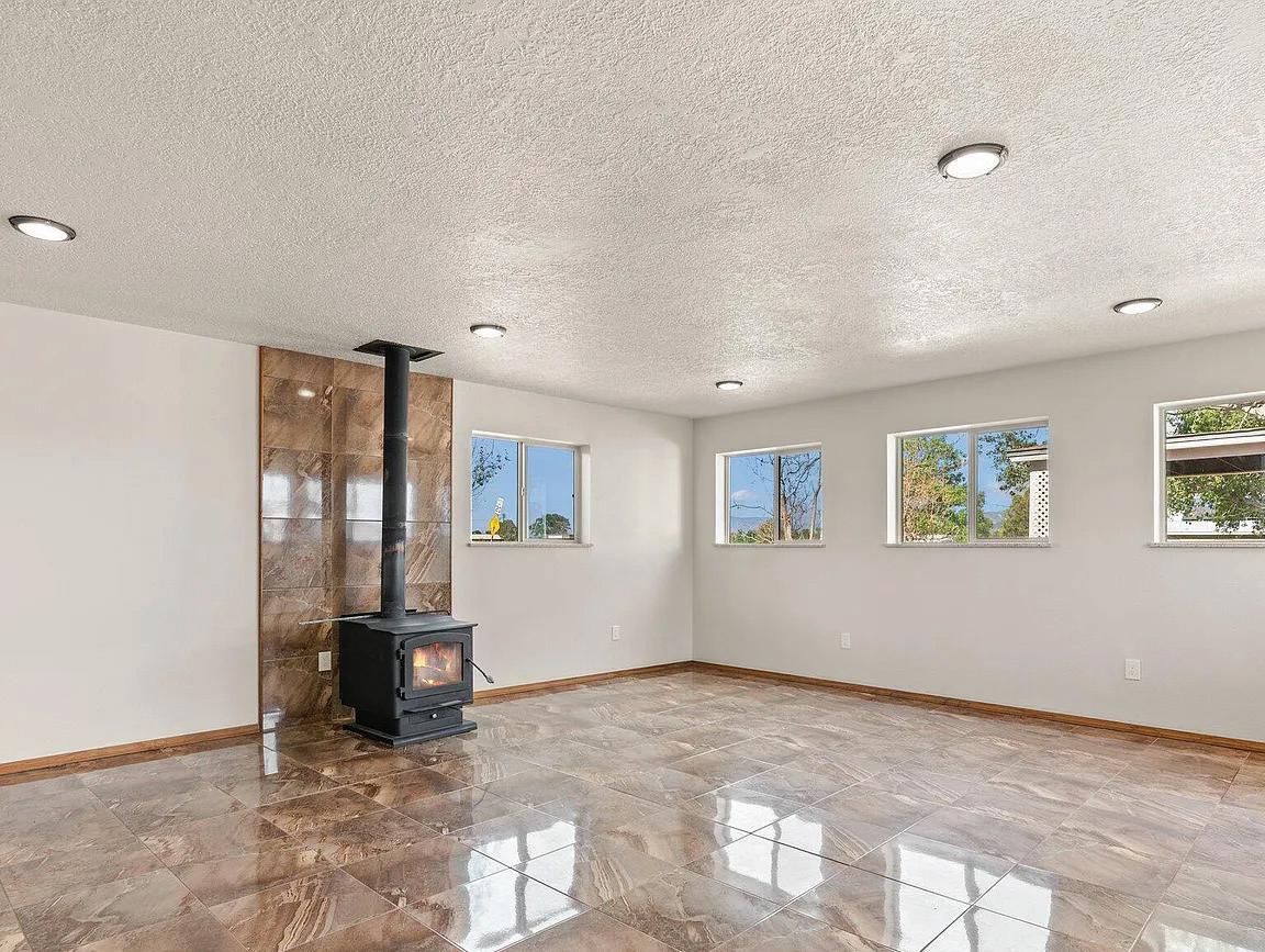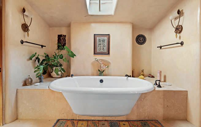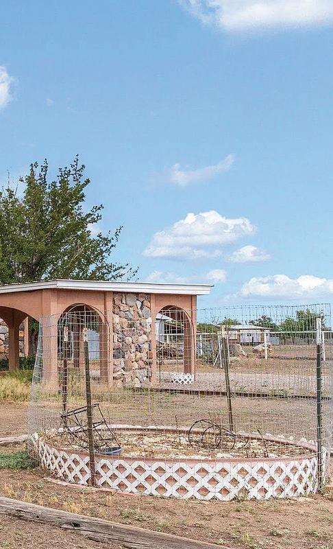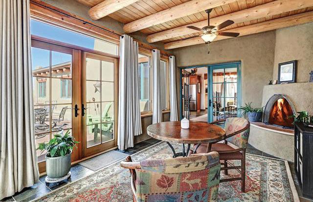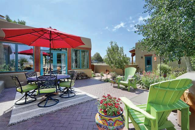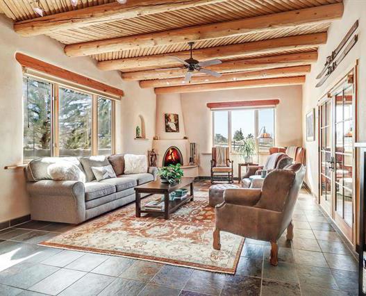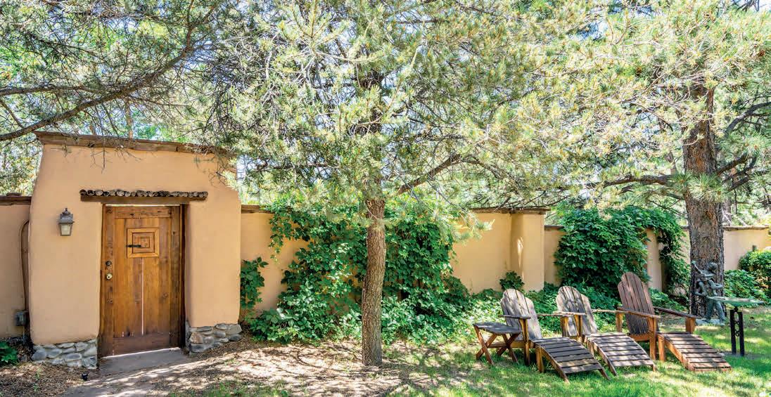 Built with a focus on natural material and handcrafted architectural elements, it features 16-inch thick adobe walls, passive solar design, hand peeled vigas throughout, antique hacienda doors, 3 Rumford wood burning fireplaces, 10 ft ceilings, large windows for abundant natural light, oversized garage with storage, and high-end appliances. The backyard is fenced with 5 ft tall no-climb fencing and features a chicken coop, a covered patio, mature vegetation, and views of Black Mountain.