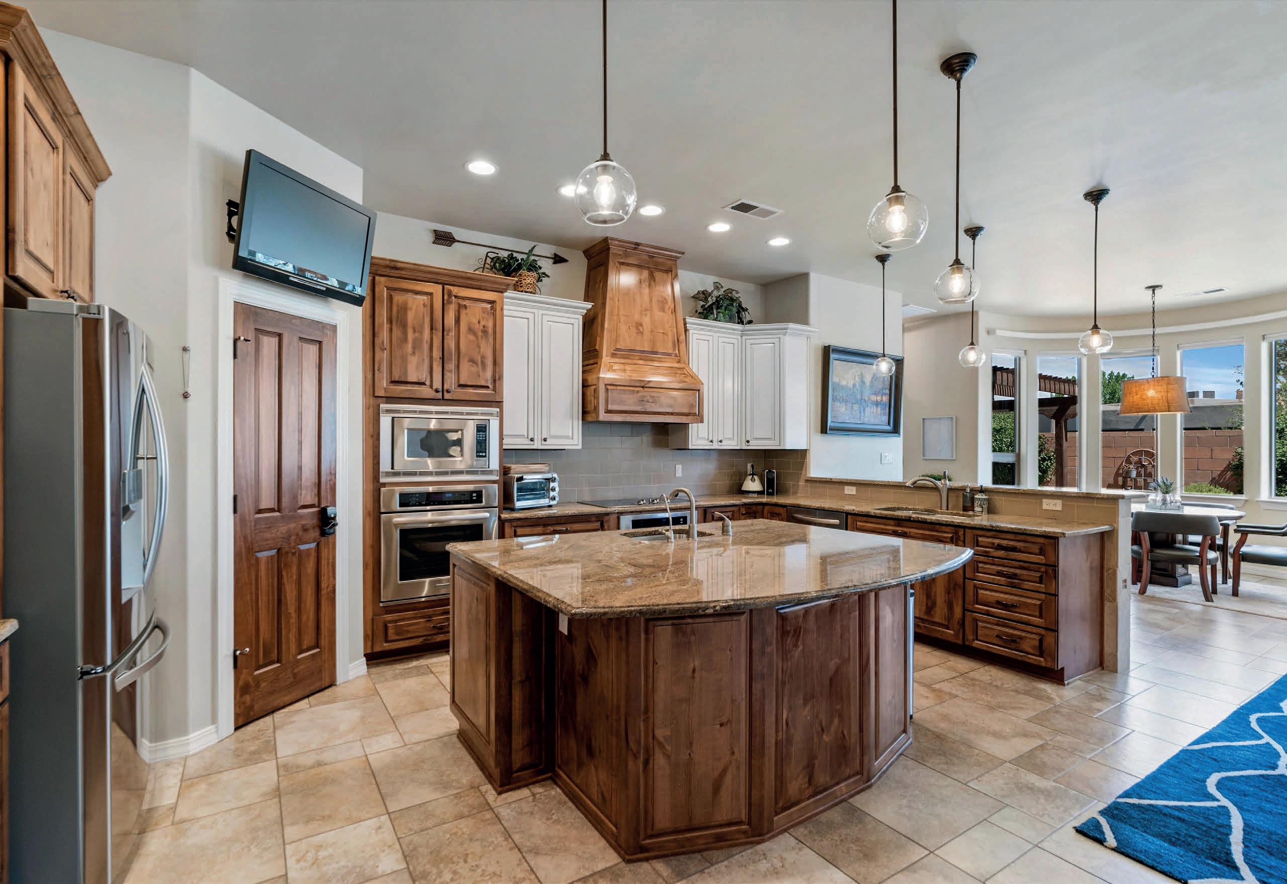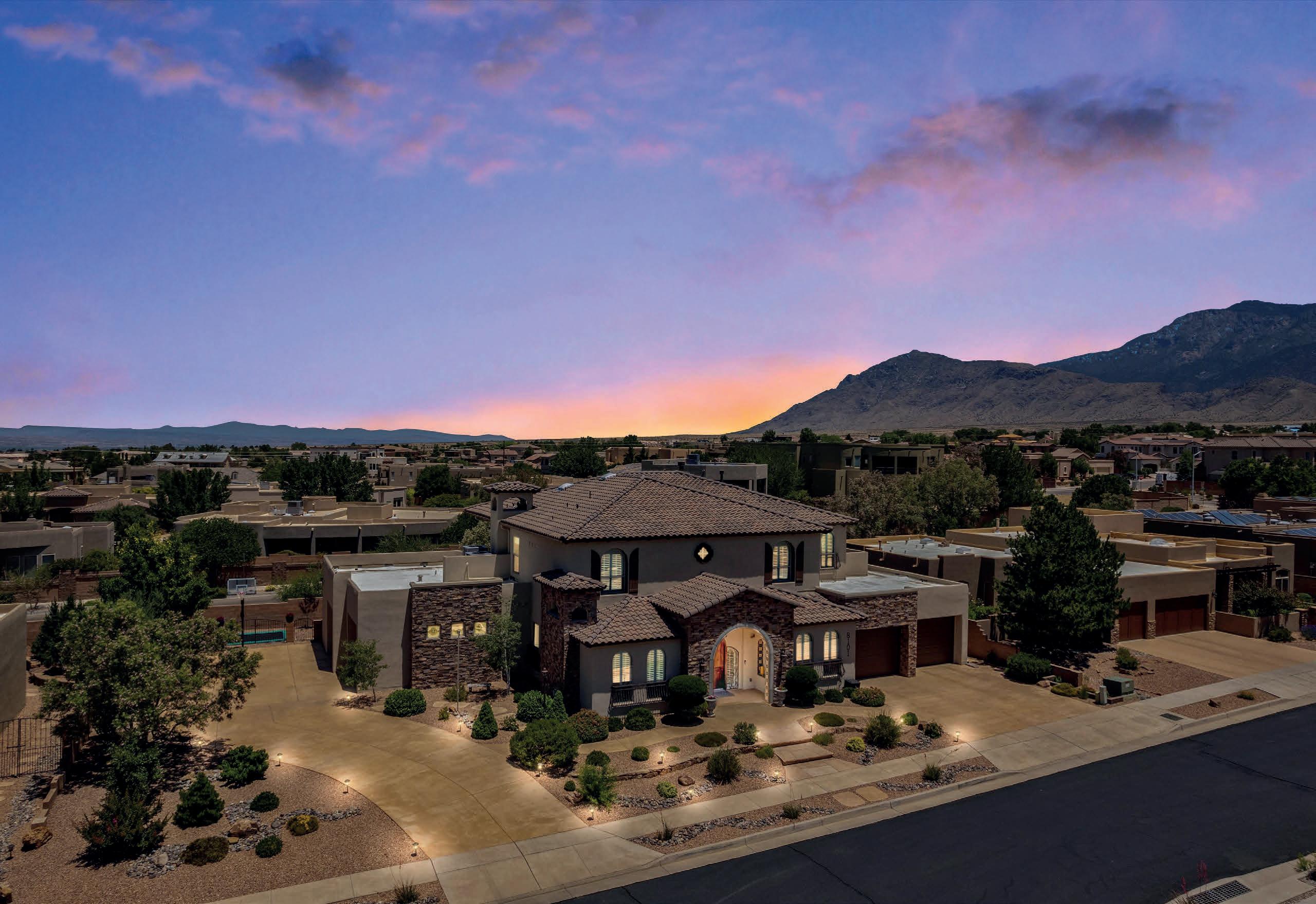 Exquisitely cared for luxury home in North Albq. Acres. Rests in the lovely gated community of Quivera Estates. The grand entryway invites you in to a warm but opulent family home with 6 bedrooms. Custom features throughout, barrel ceiling, wood beam, coffered ceilings and much more. Large kitchen with granite, ample cabinetry, SS appliances, large island and pantry. 2 staircases to upstairs bedrooms and loft. Primary suite has private balcony with beautiful Sandia Mtn. views. Large walk in closet, jetted tub and snail shower. J&J bathroom, plantation shutters, central vac, low maint. water heater. Lovely outdoor space with pergola, built in grill and gas fire pit. 4 car garage with epoxy floors and added storage room. Home is pet and smoke free! N. Star, Desert Ridge & La Cueva!