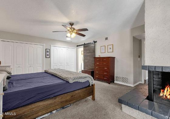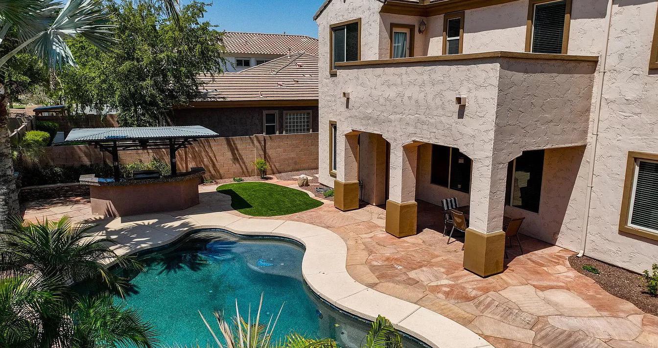 Nestled within the upscale gated community of Fieldstone Estates, this pristine home showcases an ambience of Arizona living throughout. This premium north/south facing property situated on a 1/3 acre greenbelt lot in Chandler is an entertainers delight. A gated front courtyard leads into a formal living room featuring an elegant two-way fireplace and views directly showcasing the outdoor resort oasis. This desert gem highlights ultimate living with an impressive gourmet Chef's kitchen including a deluxe island with breakfast bar, double ovens, gas cooktop, stainless steel appliances, built in fridge, warming oven, built in microwave and a large walk-in pantry. The primary suite boasts an abundance of natural sunlight offering direct outdoor access to a spacious covered patio. Custom wood shutters and two stone accent walls amplify the exquisite nature of the room. The luxe bathroom with his and her separate vanities is complete with a soaking tub, private double shower and a considerable walk-in closet. This luxurious home boasts 4 bedrooms including a guest suite/den with built-in Murphy bed and desk, a formal office with impressive bookcase and additional cozy theatre room perfect for entertaining or relaxing. Exclusive outdoor living space offers a resort style heated pool with waterfall and elevated spa backing to a vast common area. A wooden slat pergola covers a fully functioning outdoor kitchen complete with built-in BBQ, dual gas burner stovetop, electric deep fryers, wood burning pizza oven, kegerator and sink providing a significant space perfect for open-air dining. Additional lower level outdoor patio with impressive wood burning fireplace provides ample seating areas for tranquility & relaxation. Don't miss out on this exclusive property designed for superior indoor and outdoor enjoyment!