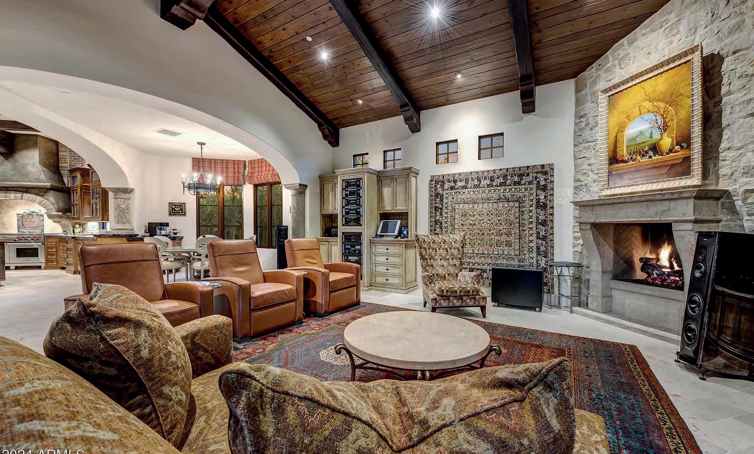 Luxurious Paradise Valley Estate - Entertainer’s Paradise! Welcome to your dream oasis in Paradise Valley, where luxury and sophistication meet unparalleled comfort and entertainment. This custom-built home boasts 6 bedrooms plus, 6 baths and over 9,200 sq ft of opulent living space. Nestled on over an acre this palm tree estate features lush grounds and several stunning fountains. As you enter through your private gates, you’re greeted by a grand motor court leading to the exquisite, handcrafted entry doors. Step into the expansive 1,200 sq ft great room with LED backlit coffered ceilings, featuring 30 ft of retractable glass doors that seamlessly merge indoor and outdoor living. A private beach and lagoon pool await, surrounded by lush tropical gardens, a tucked away spa for privacy, a circular fire pit, an outdoor BBQ area, and a large outside dining area perfect for hosting unforgettable gatherings. With extensive use of travertine, stone, and marble, along with meticulous attention to detail, this estate epitomizes the epitome of luxury living. From the old-world dining room with fireplace to the private office with a reading garden, every corner of this home exudes elegance and charm.