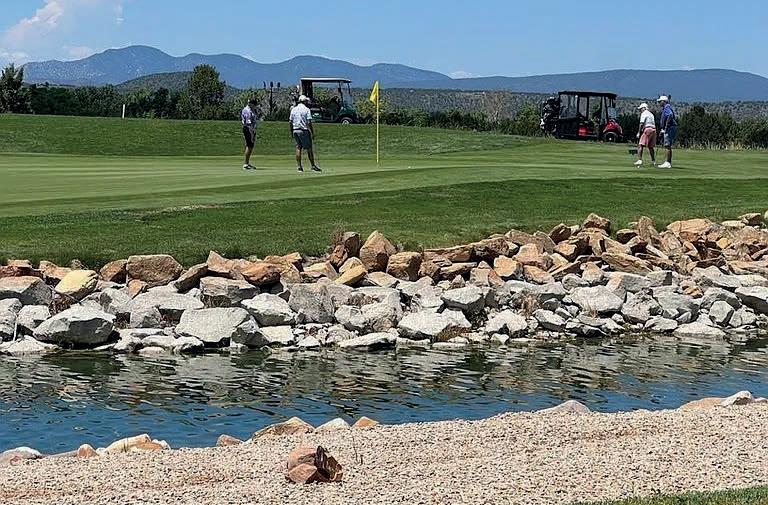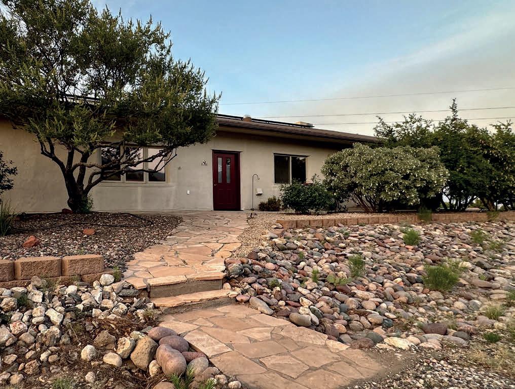 Step into the epitome of luxury and convenience with this exquisite 3-bedroom, 3-bathroom residence nestled in the heart of Pueblo Loop at Rainmakers Golf Resort. The home offers unparalleled vistas of serene waterways, the lush green fairways of the golf course, the iconic Spencer Theater, and majestic mountains that define the horizon. As you approach, a gated courtyard invites you to the grand front entry, setting the tone for what lies beyond. Inside, warm wood flooring and custom paint finishes create an inviting ambiance throughout. The open kitchen, adorned with rich wood cabinetry, a pantry, stainless steel appliances, and elegant granite countertops with casual seating, beckons both culinary exploration and relaxed dining experiences. Whether you choose to entertain indoors or alfresco, every meal is accompanied by breathtaking panoramic views. The living space embodies a distinctive Santa Fe vibe, highlighted by a curved wall of windows that frames the scenery and a kiva-style fireplace with a large banco for cozy gatherings. The primary bedroom suite features its own kiva fireplace, complemented by a luxurious bathroom retreat boasting a jetted soaking tub, dual vanity, walk-in shower, and a generously sized closet. A guest bedroom with an en-suite bath and a third bedroom (suitable for various uses) with access to a shared bath ensure flexible accommodations ideal for both home-office setups and visiting guests. Outside, the patio offers a private sanctuary under the shade of an umbrella, where you can unwind while observing the local wildlife and savoring the spectacle of magical sunsets. Additional storage is provided by a 2-car garage and a separate golf cart garage, ensuring ample space for all your recreational gear and belongings. Indulge in a lifestyle where luxury meets ease, where every day brings stunning natural beauty and the comforts of a meticulously crafted home. This is more than a residence; it’s a sanctuary designed for those who appreciate the finer things in life. 218 PUEBLO LOOP,