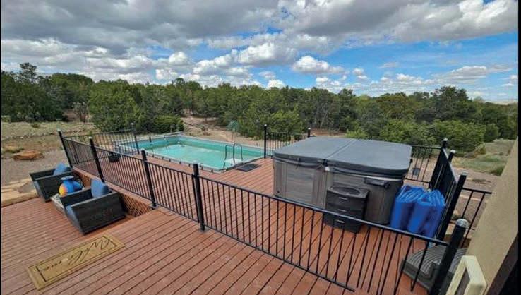 Welcome to this beautiful, updated spacious family home in highly desirable Sandia Mountain Ranch! This custom 5-bedroom, 4-bath home is situated on a fully landscaped oasis offering privacy and maximum enjoyment for all! New xeriscape custom lighted pathways lead to solar lighted fun and relaxation zones including picnic tables, tetherball, horseshoes, pull up bar / workout area and hammocks. Enjoy full surround sound with 11 speakers strategically placed throughout the property! Huge deck off the living room incorporating a refreshing pool and relaxing hot tub, provides a vacation type vibe all the time! Room for the pets as well! Back-yard is fully fenced, large custom chicken coop, and custom built catio! Full RV hook-up with electrical, sewer and water. (See more property remarks)