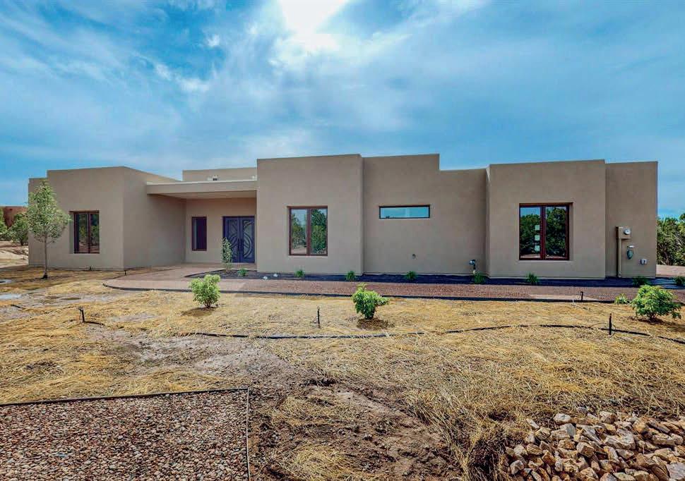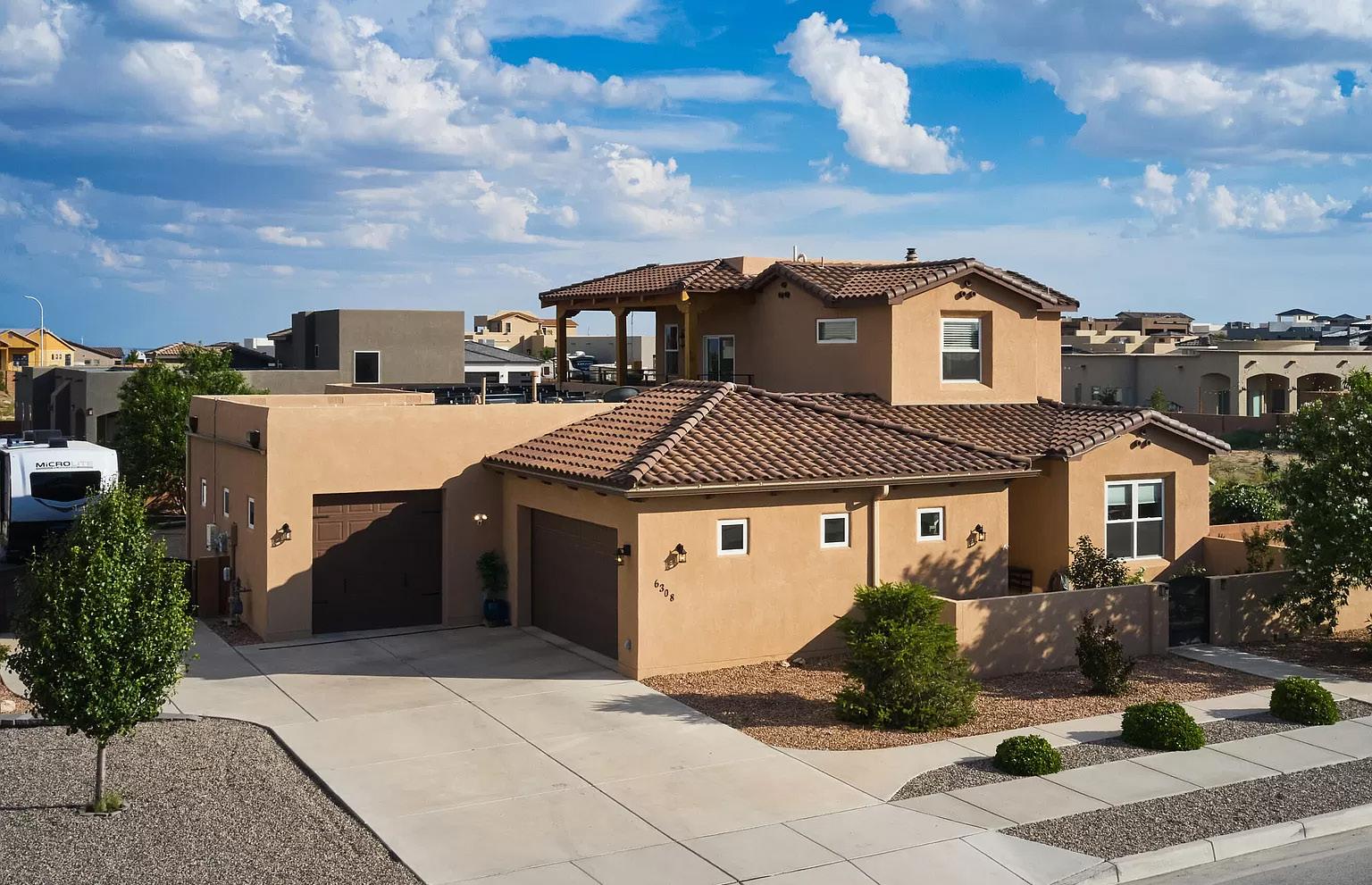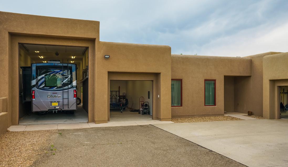 This spacious, beautiful home is waiting for you. Featuring a HUGE 1,695 sq ft, 4-CAR GARAGE PLUS!!! These warm surroundings offer 2,663 ft of living space with 3 bedrooms & a separate office. Enjoy the spa-like primary bath! Gourmet kitchen & lovely outdoor space will suit all your entertainment needs with comfort & style. Skylights & big windows surround the interior bringing in plenty of natural light. Nestled on a generous 1.5-acre lot, this home boasts breathtaking views of the Sandia Mountains and the sparkling city lights. Love nature? Hiking and biking trails surround this welcome oasis. Check out the Mariposa community center which features 2 pools & full gym. Neighborhood restaurant opens soon!