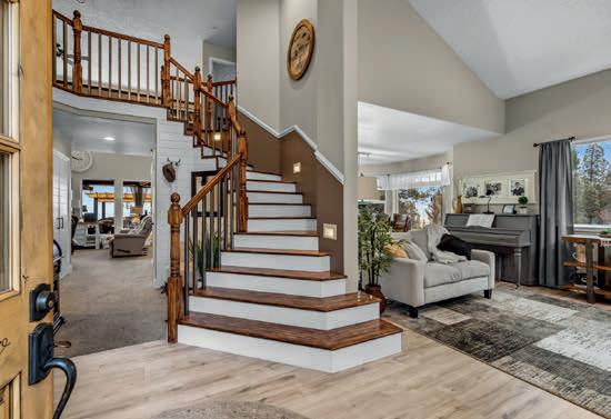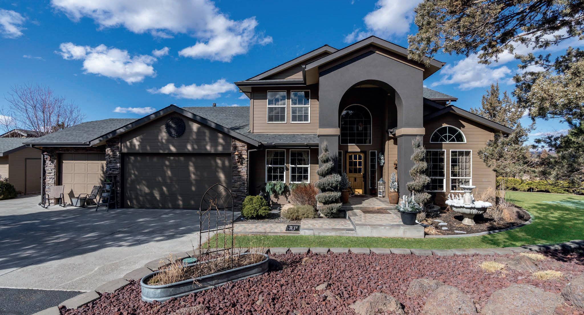 This remarkable 5 bedroom, 4 bath, 6052 sq ft contemporary NW style home delivers quality craftsmanship & design. Perched atop 0.79 acres on Awbrey Butte, you will be captured by stunning panoramic Cascade Mountain views from Three Sisters to Mt. Adams. Living room boasts 14-foot ceilings with full windows. Kitchen features professional Viking appliances and granite countertops. Primary bedroom is on the main level, highlighted with Italian marble in the bath, large soaking tub, fireplace and large shower, walk-in closet, and direct access to expansive deck and hot tub. The main level has 2 additional bedrooms, dedicated office, and formal dining. Lower level highlights a large entertainment great room with pool table, shuffleboard, bar, wine room, theater room, fitness room, 2 bedrooms and a full bath. Outdoor living is enhanced with nearly 2000 sq ft of deck and patio, hot tub, raised garden beds, & park-like setting. Expansive 3-car garage, it has everything you want in a home! MLS# 220155867