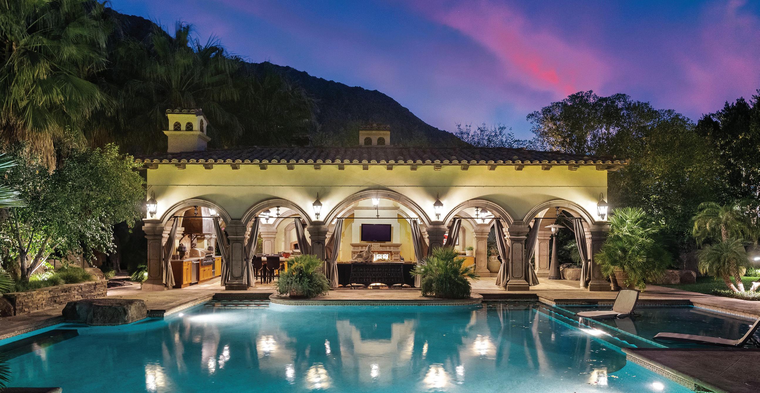 Enjoy Old World charm from your own private, walled villa. Whether you’re entertaining 2 or 200, host in style from the expansive 2-lot property with more than an acre of majestic landscape. Designed by Architect Juan Carlos Ochoa and built by Paul Golden in 2007, this home is built to last. Only the finest materials were selected with impeccable craftsmanship and exquisite finishes throughout, including double-groin vaulted ceilings and archways, Venetian plaster, wood-beamed ceilings, custom Cantera stone pillars, arches, fountains, 10 hand-carved Cantera stone fireplaces, and extra deep walls. Additional interesting and creative touches include hand-carved interior mesquite doors, custom-designed Italian mosaic tiles, and custom iron work. Retractable walls-of-glass open to the expansive front patio to take in the stunning panoramic views. 75’ pool with lap lane, 2 spas, pool pavilion with fully equiped outdoor chef’s kitchen, 10-hole putting green.