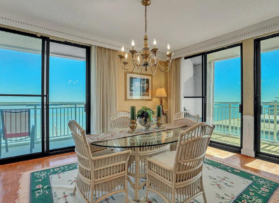 On the main floor, there’s a guest bedroom and an office (or second guest bedroom), sharing a private full bath. The owner’s suite is a serene retreat, showcasing stunning water views through floorto-ceiling windows and direct access to the deck. The luxurious ensuite bath features a Jacuzzi tub and separate shower for ultimate relaxation.