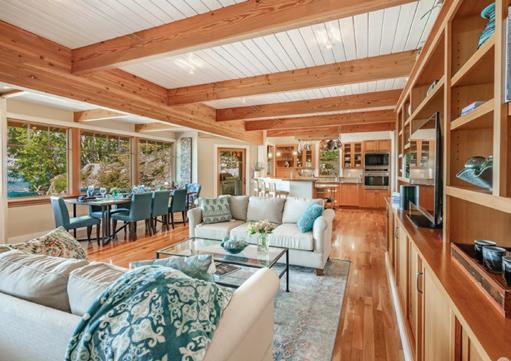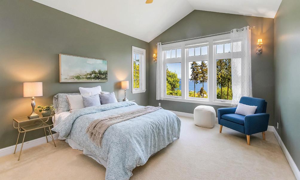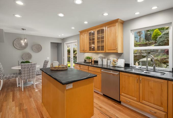 MLS 2250327 & 2251146 | $2,350,000 Sweeping, panoramic Southwesterly views of Lake Washington from both floors of this 4 bedroom, 3 bath home across the street from the Lake in the coveted Holmes Point community of Kirkland. Completely renovated over the past two years with a new roof, all new kitchens (2) and baths (3) with high end fixtures and finishes, including wide planked French White Oak floors, custom designer tile, new lighting, and new quality cabinets & counters. This 3,130 square foot home was carefully crafted in 1975 with period architectural details including open beam cathedral ceilings, light-filled spaces with walls of windows and huge view decks and patios perfect for large summer BBQ’s. Spacious floorplan includes a lower level second kitchen and large view recreation room. The lot is 18,038 square feet (.41 acre) and includes sunny garden areas, multiple large patios and a spacious 2 car garage. Fabulous location in the heart of Holmes Point – a short stroll to the waterfront Denny Park, neighborhood boat launch, 600+ acres of pristine forests & trails, and a short drive to iconic Inglewood Golf Club and all shopping services. Awardwinning Lake Washington School District including top rated Sandburg Elementary. Enjoy the best the Northwest has to offer with ever-changing vistas, maritime performances and golden sunsets from this spectacular view property!