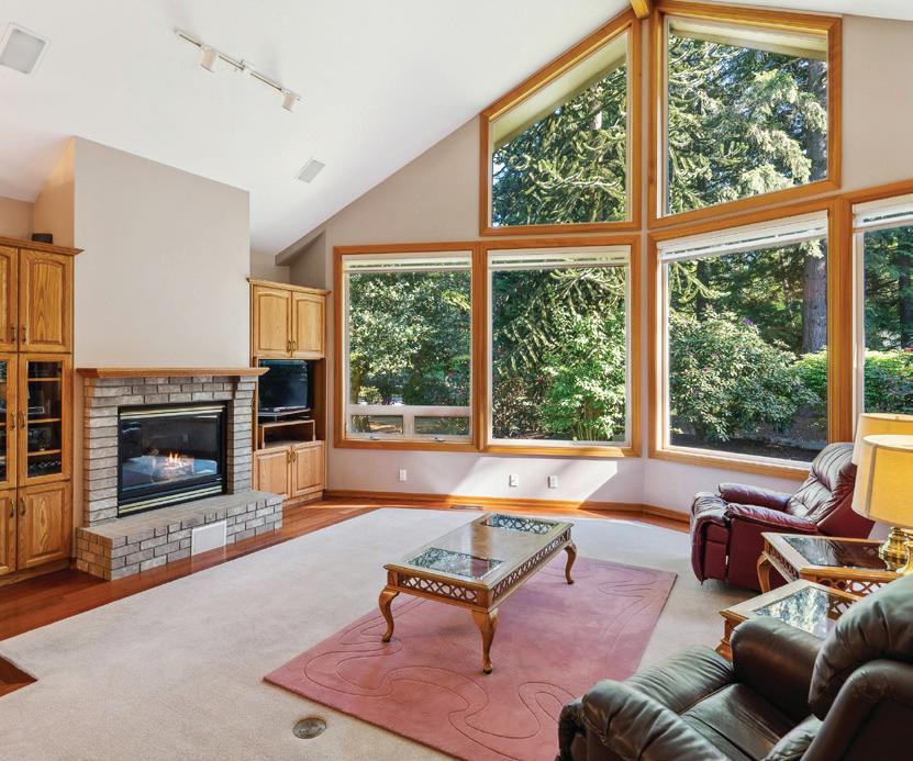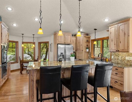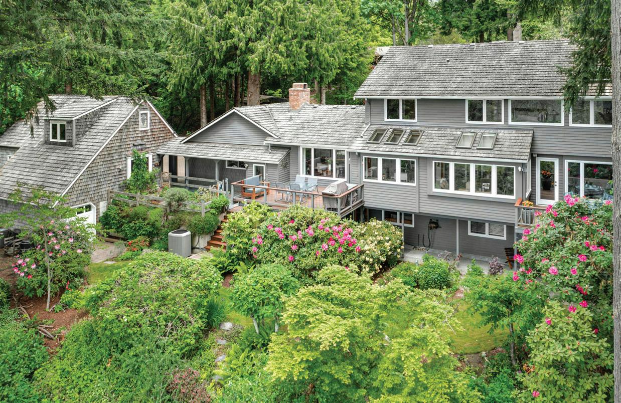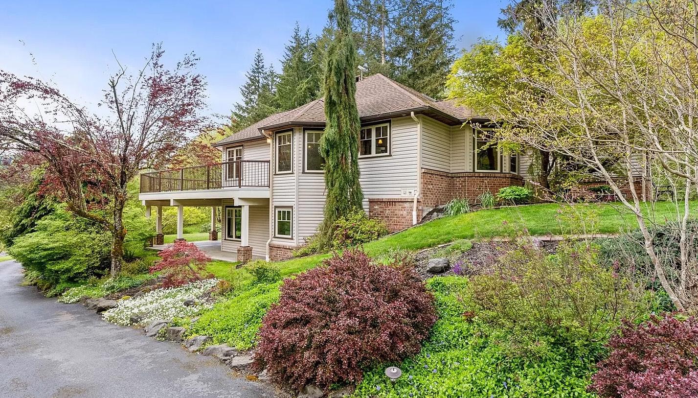 MLS 2240541 | $2,500,000 Amazing quiet and private forested oasis! 1.32 acres of lush grounds with beautiful 4,372 square foot custom 5 Bedroom, 3.5 Bath home originally built in 1966, and fully renovated in 2009. Carefully reimagined light-filled interior in 2009 includes a chef’s island kitchen with Viking Professional and SubZero appliances, granite counters, custom wood wrapped skylights, high-end fixtures and finishes including Grohe, Franke, Hubbardton Forge & Holtkoetter lighting and Distributive audio. Light-filled main floor family room with wide planked floors and box beamed ceiling, lodge inspired living room and masonry fireplace, large formal dining room, main floor office with double hung French windows, spectacular upper level primary suite with cathedral ceiling, sitting area with masonry fireplace, spa inspired updated bath, and beautiful westerly views. Handcrafted interior with exposed wood beams and natural wood accents including extensive amounts of wide plank pine, vertical grain fir and oak, along with original used brick fireplaces, exterior veneer and entry and glass doors to large tigerwood deck with forested Seattle skyline views – perfect for both nature and sunset enthusiasts! The lower level includes a natural barnwood paneled rec room with wet bar, sauna and a number of bedrooms / flex rooms. This amazing property includes a detached carriage house with a finished heated office and 537 square feet of storage, including 335 square foot upper level which could be converted to a guest apartment or ??? and 200+ square foot lower level shop with rollup door along with garage parking for four cars. Charming gated entry and circular driveway open to the arboretum-like grounds with spectacular mature evergreens and plantings. This unique and incredible property adjoins 600+ acres of protected forests, trails, and waterfront parks, is incredibly private and quiet, yet is just a short drive to historic Inglewood Golf Club, vibrant Juanita Village, and eclectic downtown Kirkland. Award-winning Lake Washington School District. Don’t miss this one-of-a-kind property, offering a unique combination of luxury, quiet privacy, and natural beauty!