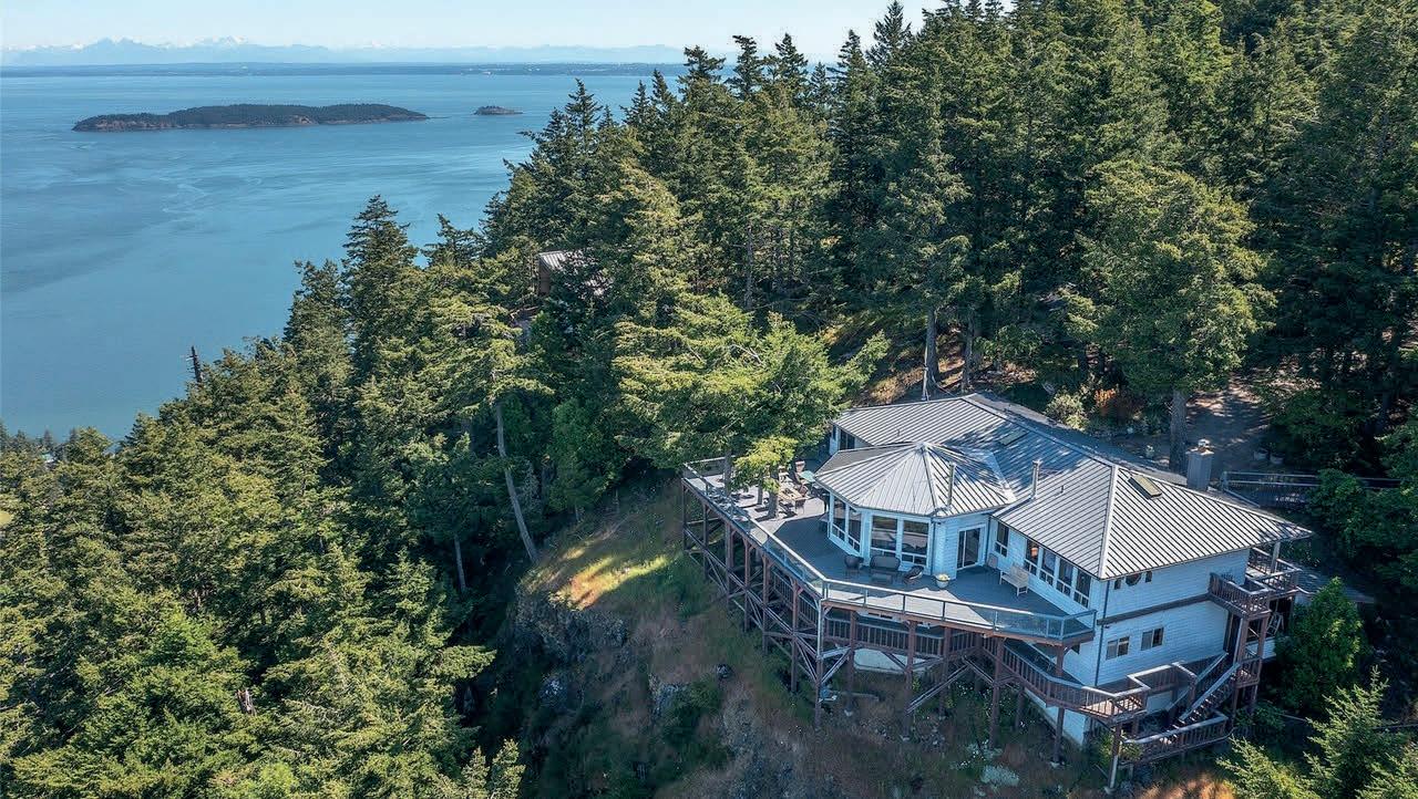 Stunning contemporary home located next to a pebble beach, designed by renowned NW architect Geoff Prentiss, one mile from Friday Harbor. With an impossible-to-replicate location, this south-facing home enchants with large sunny view decks over the water, outdoor fireplace, and pocket beaches to become your island refuge. The cabin’s island aesthetic utilizes natural materials including fir floors and windows, stone, copper, and concrete accents, and live roofs. Detached one car garage, and separate flex space with views and sauna. Beautiful yard with large fruit trees enhances the magic of this special property, which adjoins 1.85 acre UW land. Exterior of buildings newly painted, fiber optics installed, and new irrigation system.