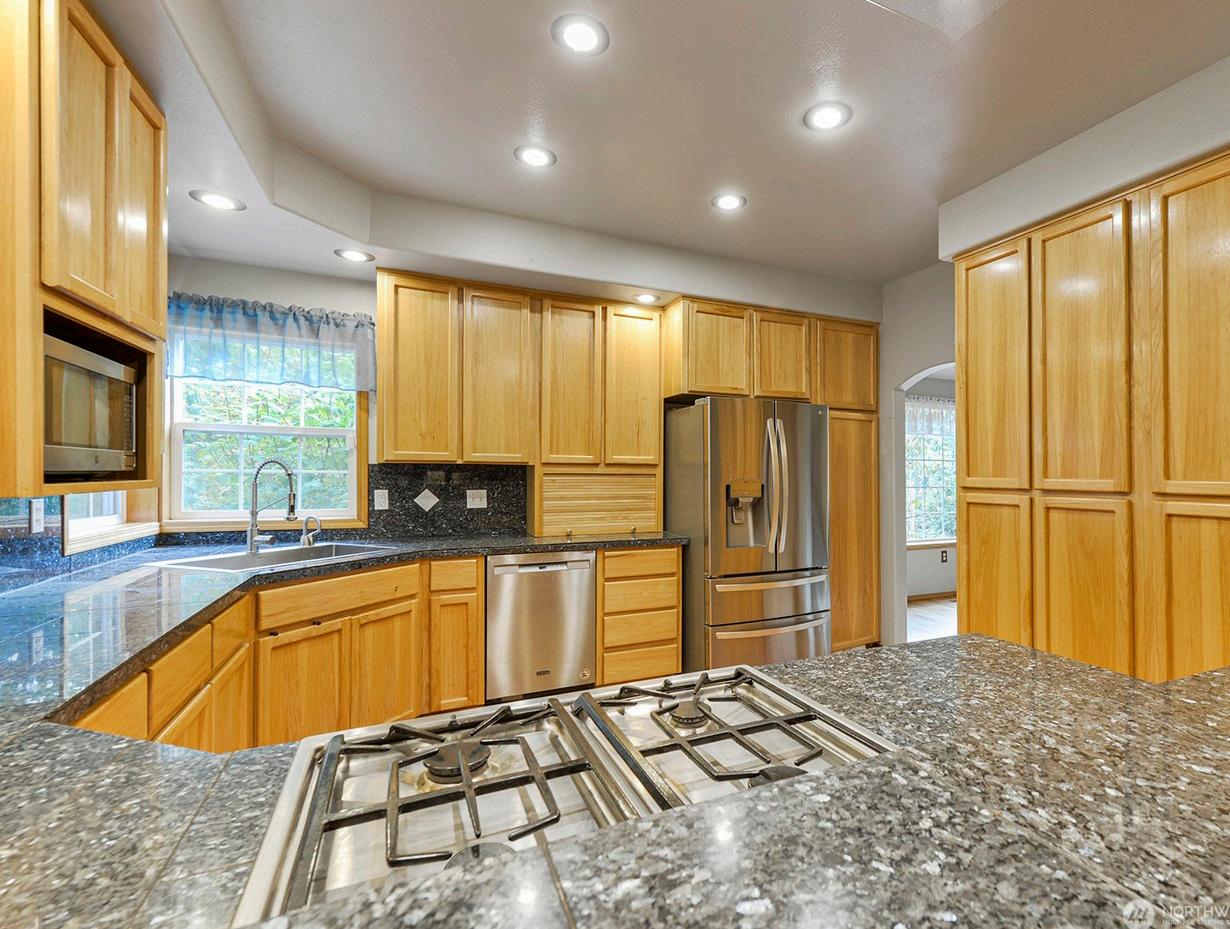 Immaculate & private home with circular drive on parklike 2.6 acres with a shop! Designed to live comfortably & entertain beautifully, the home features soaring ceilings, beautiful wood-work, is light & bright with windows everywhere viewing the beautiful greenery all around you, & so much more! Updated kitchen with island flows out through slider, perfect for entertaining! Room for toys & hobbies with huge shop.