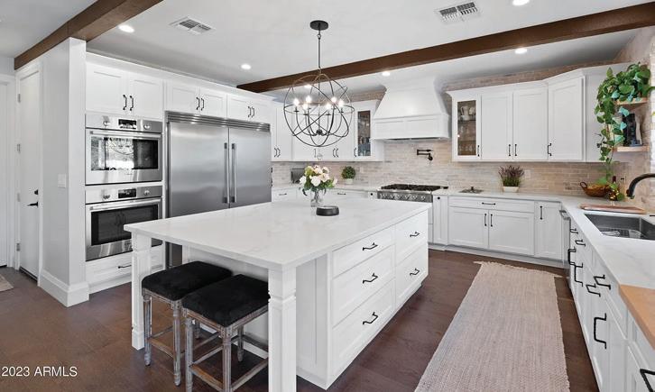 4 Beds | 3.5 Baths | 3,124 Sqft. This custom, remodeled home sits on a quiet, large lot in the coveted Cactus Corridor. The property was brought down to the studs and redone with timeless finishes throughout. Featuring 4 beds/3.5 baths, and an open, great room floor plan. The grand entry invites you in to vaulted, beamed ceilings, a wood burning fireplace, stone entertainment wall, wine storage and multiple beverage fridges. The gourmet chef’s kitchen features ample storage space, large island, oversized fridge/freezer, 36’’ gas cooktop, two wall ovens, and an in the counter steamer. The elegant owner’s retreat has a walk-in marble shower with dual shower heads, a separate free standing soaking tub and opens up to the picturesque, resort style backyard. The lush half acre property has an abundance of covered patio space, a massive salt water diving pool with new mosaic tile and pebble sheen finish, built-in bbq and a grand stone gas fireplace. Everything in this home has been thoughtfully designed. Also has new AC units, roof, water heater, and spray foam insulation.