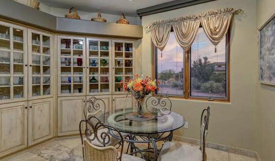 Southwest style with an immense amount of top of the line custom finishes & attributes. Private courtyard entry. Above the arched wood front door is a beautiful stained glass work of art. Winding staircase as you enter that is quite the show piece. Formal Living and Formal Dining. Den has corner fireplace, beamed ceiling, built in entertainment center & full bar area. Breakfast area in the breezeway, also with beamed ceiling. Gorgeous kitchen has GE Monogram appliances, TV, island with sink, wine fridge, dish display rack in cabinet above main sink. Media room has exit doors to driveway & backyard, small bar area & large flat screen TV. Oversized utility room with plenty of cabinet space, sink, washer & dryer. 1 bedroom on