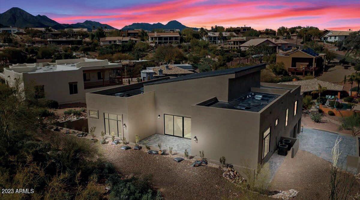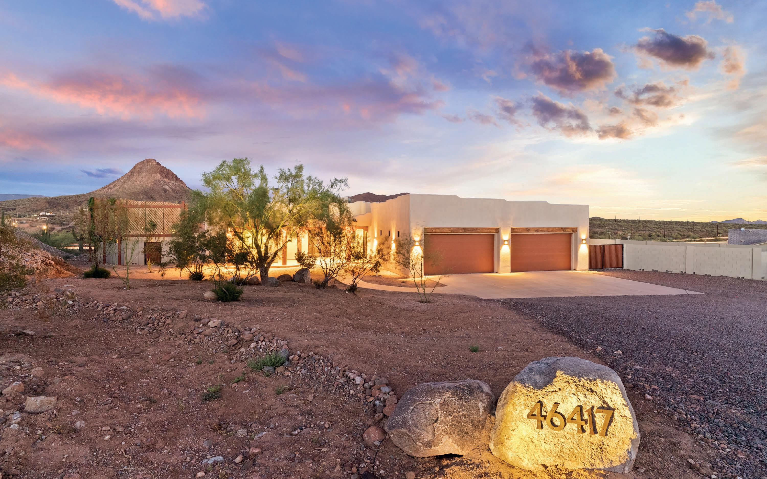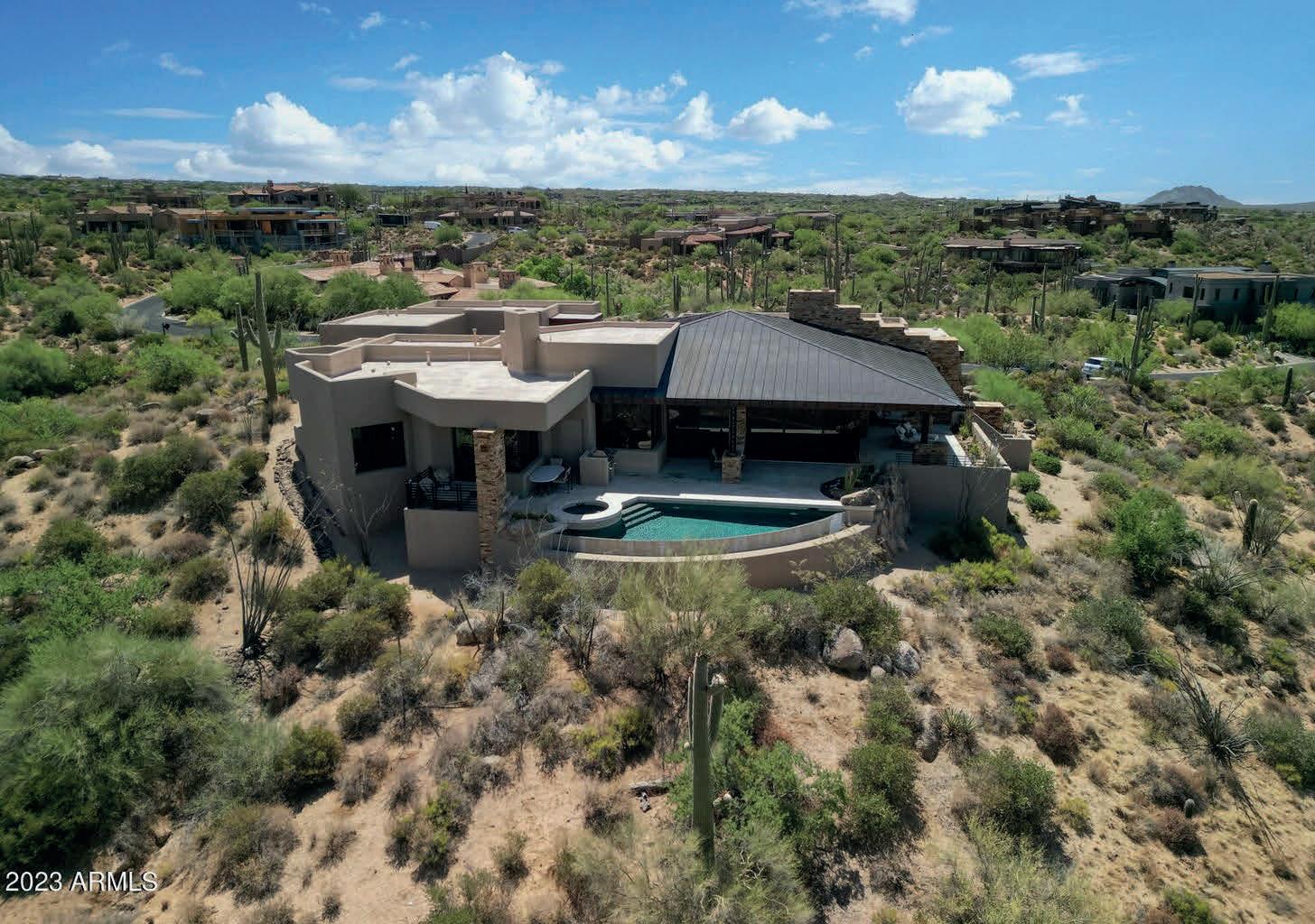 Coastal California meets the High Sonoran Desert with a one-of-a-kind contemporary estate on 2.2 acres in Desert Mountain, North Scottsdale. This serene and private property offers breathtaking views from the McDowell Mountains to Pinnacle Peak, sparkling city lights, emerald green golf course views, and stunning sunsets. The interior is light and open, with an abundance of natural light, telescoping doors, and a functional great room floor plan on the main level. The lower level features a game room, media room, and additional suite options. Outdoor amenities include a lap pool, spa, fire features, and plenty of space for outdoor living. This home also offers a high-end audio video system and an elevator for easy access between levels. With its turnkey sale, this property is ready to impress and is an ideal choice for those seeking a contemporary oasis in the Sonoran Desert.