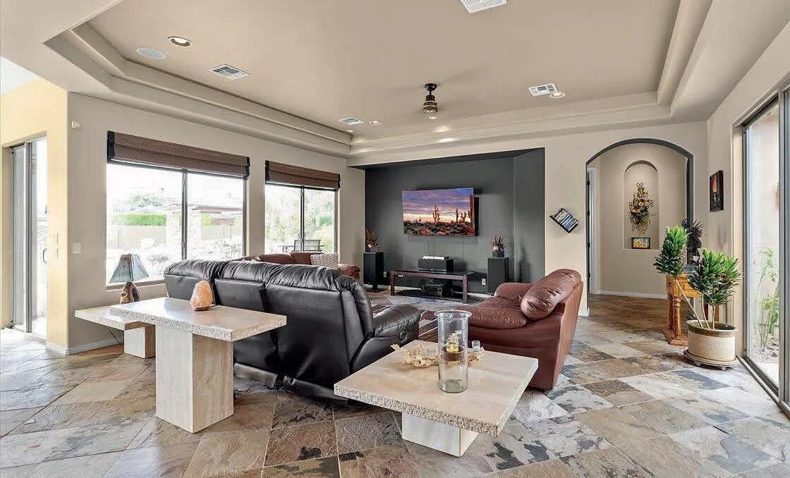 Rustic Contemporary at the Heart of Cave Creeks desired entertainment area. One of the original builds using super insulated 8’’ thick foam walls (R40) and 12’’ thick ceilings (R60) coated with GFRC. Imagine living inside an ice chest, cool and quiet. A 10’ custom door at the entry opens into an expansive Great Room with 14’ to 17’ high ceilings, gas fireplace, and clearstory windows. The Kitchen has Bosch appliances, 9’ island and custom cabinetry. Two large bedrooms and a Den, two luxurious baths plus a powder room. All Commercial grade, Low-E tinted glass in windows and doors. Come and enjoy your back patio with both sunny and shady sitting areas, fountains, gardens, gas firepit, and custom BBQ island with views of the hillside to the North. The Community Pool could not be closer! This home comes with a two car garage with 8’ high garage door and 10’ ceilings. The slab in front will accommodate two additional cars for your guests. Interior walls are also smooth coated with GFRC for structural integrity.