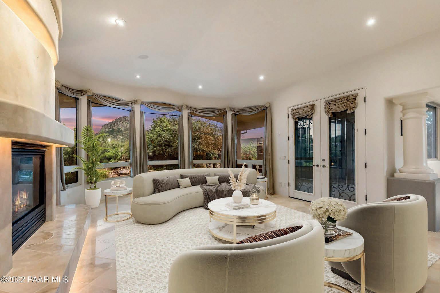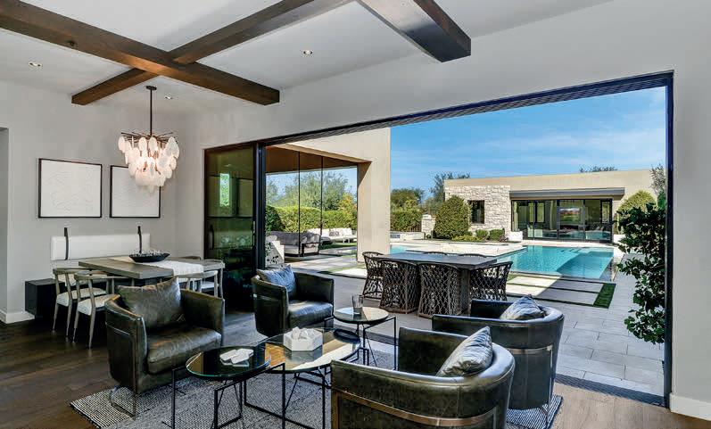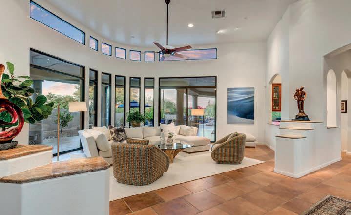 of sleek, clean lines & features, floor-to-ceiling windows - 6 panel retractable door system that opens & disappears into the wall connecting indoor & outdoor living areas. Panoramic views of several greens, fairways & Mountain ranges. Interior features: 26ft high ceilings in great room, polished concrete floors, chef’s dream kitchen w/retractable windows, custom cabinetry, large island, luxurious master suite, large walk-in closet, double vanity, Jaccuzi tub w/ views, modern finishes, private office, large bonus room, 3 upper decks, expansive ext patio, fenced yard, Custom Lap pool 25 ft x 12 ft w/ spillways & controlled by an app, large garage & much more.