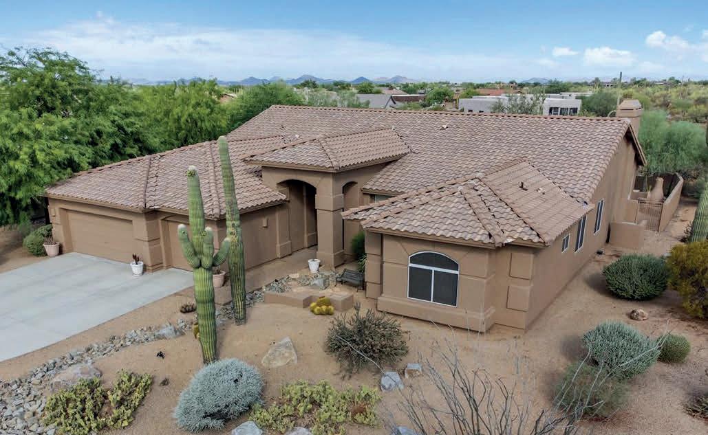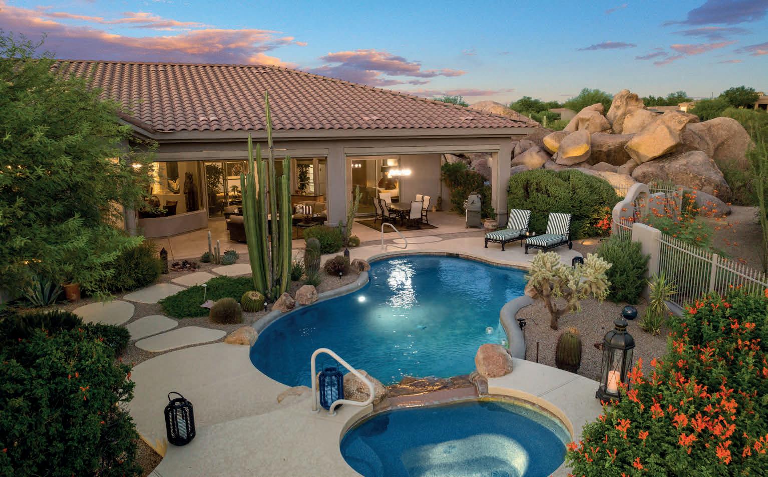 Encircled by dramatic boulders and the tranquility of the natural desert, this is more than a home—it’s a retreat. Nestled in by Pinnacle Golf’s 5th hole, the majestic Pinnacle Peak looms gracefully on the horizon. Inside, soaring ceilings harmonize with a gourmet kitchen boasting granite countertops, expansive island, and GE Monogram appliances. The primary suite is a realm of peace—where a calming sitting nook awaits reflection, paired with a generously appointed walk-in closet. 3 additional bedrooms and 3.5 additional baths ensure ample space for guests. Outside, crystal waters of the pool beckon, the spa promises rejuvenation, and remote control shaded patio provides resort-like leisure. Dive into this harmonious blend of comfort and nature, embodying the essence of North Scottsdale!