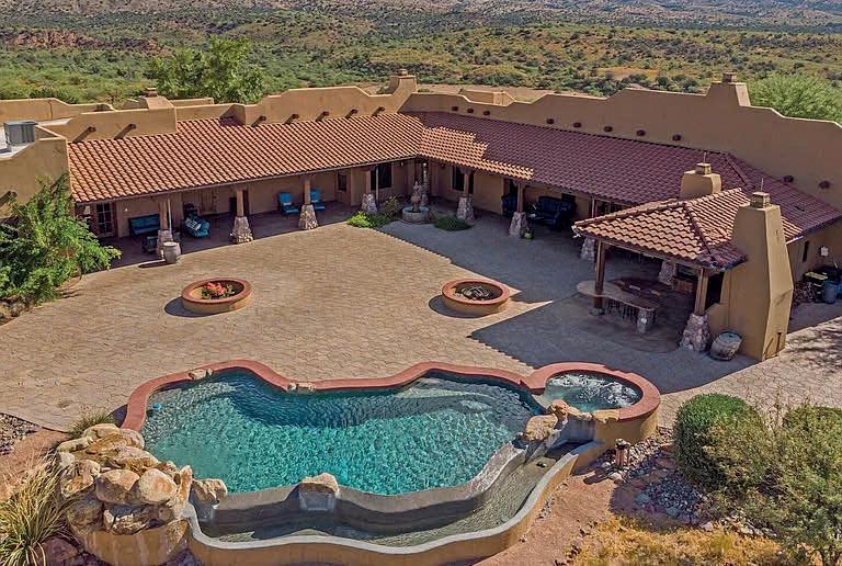 One of a kind property less than 30 minutes south of Payson is situated on 10+ acres bordering national forest. This 6,000+ sq ft Southwestern style home has 4 bedrooms, 6 baths, attached guest house with its own two car garage. Oversized three car garage plus storage area for main residence. Large Courtyard with infinity pool, outdoor kitchen w/ pizza oven. Misting system on covered patios. 360 degree panoramic views of the Arizona high desert and mountains! Commercial back up generator, brand new solar panel system with no payments or lease. Unique property located less than 30 minutes south of Payson, nestled on over 10 acres that border national forest land. This exceptional Southwestern-style home, spanning over 6,000 sq ft, boasts 4 bedrooms and 6 baths. The property also features an attached guest house with its own two-car garage, adding to its allure. In addition to the oversized three-car garage, there’s a dedicated storage area for the main residence, ensuring ample space. A spacious Courtyard graces the property, complete with an infinity pool and an outdoor kitchen featuring a pizza oven. Enjoy the comfort of misting systems on the covered patios, perfect for relaxation even on warmer days. Revel in the breathtaking 360-degree panoramic vistas of the Arizona high desert and the surrounding mountains, offering a truly immersive experience. Practical amenities include a commercial backup generator, providing peace of mind, and a brand-new solar panel system that requires no payments or leasing obligations. This property stands as a testament to distinctive living amidst natural splendor.