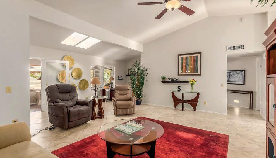 Golf course & mountain view lot! True one-level living! Turn-key home in Fountain of the Sun. Enjoy your morning coffee on the private patio with golf course and mountain views. Granite countertops throughout, stainless-steel appliances, open floorplan & updated bathrooms! This home features natural light with solar tubes and abundant windows in the oversized great room with spacious vaulted ceilings. Fountain of the Sun is a 55+ active adult community, featuring a community pool, clubhouse, gym, golf course, gated entry with guard staff and other onsite amenities.