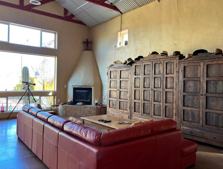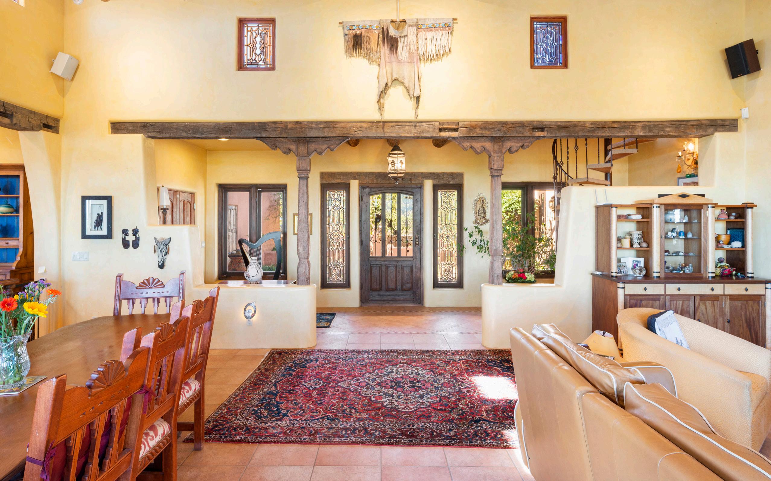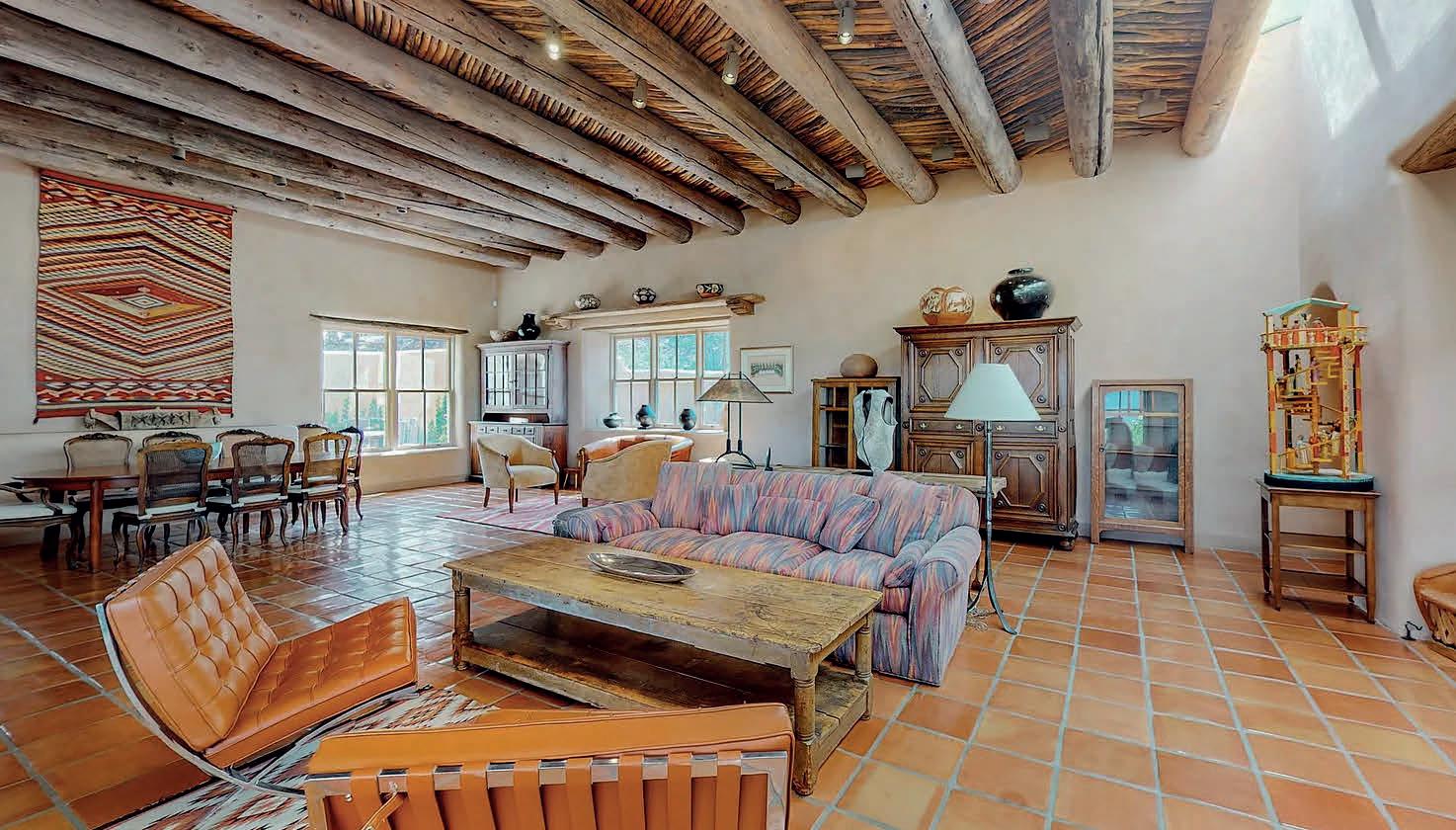 Imposing property on 4 acres set into a hillside with full on views of the Sangres de Cristo mountains in gated Casas de San Juan, near the world famous open-air opera house. Both the main house (mostly adobe) and the guest house are loaded with traditional Santa Fe features. With a 1000 sq ft living room, wrap around portals and courtyards, and ample parking it’s a perfect venue for large gatherings. Plenty of accommodation too, including a 4 berth cabin inside the detached 3 bedroom guest casita that has a full kitchen, living room/studio and all those views. A charming, light filled property that in its peacefulness, quietude and style, harkens back to the soulfulness of traditional Santa Fe homes.