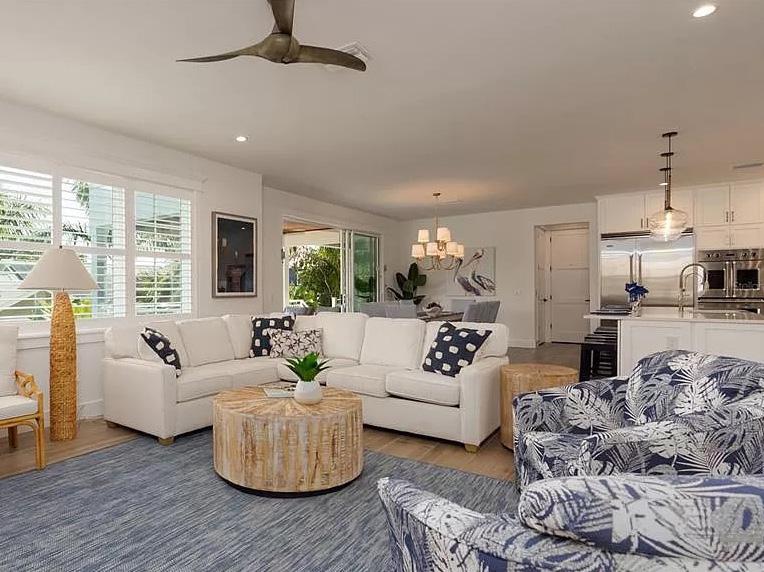 Experience island luxury in this key royale canalfront home on a corner lot with sweeping water views and extra privacy. Located in holmes beach on anna maria island, one of coastal living’s 'happiest seaside towns', enjoy leisurely days on soft, white sands and elegant island living. The grand front porch is perfect for seaside sounds and sights. Inside, open spaces merge with natural light and a beach-inspired palette. The kitchen features a center island and stainless appliances. Sliding glass doors invite breezy indoor/ outdoor living. The owner's retreat includes a spacious bath with dual sinks and a large walk-in shower. Two additional bedrooms offer privacy. The canalfront area boasts tropical landscaping, an outdoor kitchen, shaded dining, a pergola, and a heated pool. A dock ensures easy boating. Optional social and golf memberships are available at key royale golf club.