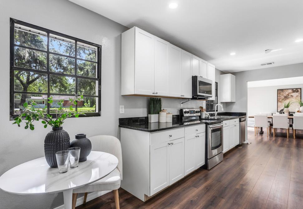 A stunning waterfront residence on Lake June is now available. This fully remodeled, move-in-ready home features a new roof, A/C system, and water heater, ensuring modern convenience and comfort. The chic kitchen boasts white shaker cabinets and white quartz countertops, complemented by updated flooring and fresh paint throughout the interior and exterior. Both bathrooms have been tastefully modernized. The property includes a spacious dock and seawall, set on over half an acre of direct lakefront real estate, making it ideal for luxurious lake living with meticulous attention to detail and a comfortable floor plan.