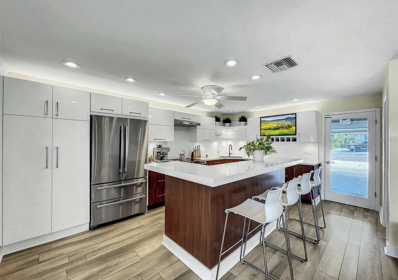 You will love this community as it is built inside its own park with lakes, gazebos, walking trails, park benches, fishing and biking. We are a super dog-friendly niche community with a well-maintained emphasis on canopy Live Oak trees & appealing landscaping. ARRIVE HOME to this stunning Florida Chalet as the OPEN FLOOR PLAN and engineered (reclaimed) hardwood flooring sets the stage for a truly Zen experience. Your recently renovated home pulls the common areas together to enjoy the Lounge area, oversized kitchen and cafe' plus the dining room. These rooms are ACCENTED by the sun drenched atrium AND a full wall of glass focused on your courtyard vistas of the pool. The gourmet kitchen anchors this beautiful home with Merillat Honey Walnut soft close cabinetry complete with pull out shelving, matching suite of Kitchen Aid Stainless Steel appliances that includes an induction cooktop with drop down Brisas exhaust fan, convection wall oven and microwave, dishwasher and a deep sink ALL pulled together with gorgeous granite that has 2 waterfall edges and backsplash. The Living room, Dining room and kitchen all share the window and atrium views of the GOM PARK and lake as this is an end unit! The family/TV room with an ethanol Ecosmart Firebox fireplace AND the kitchen also shares the courtyard pool panorama views. The two bedrooms are a "split plan" at opposite ends of the home. The Primary bedroom suite is oversized (25'x12) and sports a full glass wall of pool vistas PLUS an ample sized master closet with custom build out AND an enlarged custom designed bath with regular and rainfall shower head and a roll in accessible entrance. Bedroom # 2 is ample sized and has custom shelving/cabinetry in the closet. There is an indoor laundry room with a matching suite washer & dryer. You will love your very private SALT WATER pool with Heat Pump Heater, set in its own courtyard with newer pool cage AND as a bonus, the WALL ART that was commissioned at a cost of $10,000 will convey! The two car garage has a new electric panel and built-in cabinetry Plus has the rare GOM feature of TWO large louvered windows for ventilation and park/lake views. For INSURANCE and HURRICANE concerns, this home has had ALL of the windows and sliders including the entrance side light replaced by Window World with impact glass AND there is a wind rated garage door, "3rd Nail" installation AND THE CONCRETE TILE ROOF IS ONLY 1.5 YEARS OLD! But wait...there's more...The attic has spray foam insulation, all HVAC duct work has been replaced including new returns AND new HVAC 1.5 years ago! You will love the Glen Oaks Manor Lifestyle. Offered for sale at $675,000 with SOLD comps to support this price! $675,000