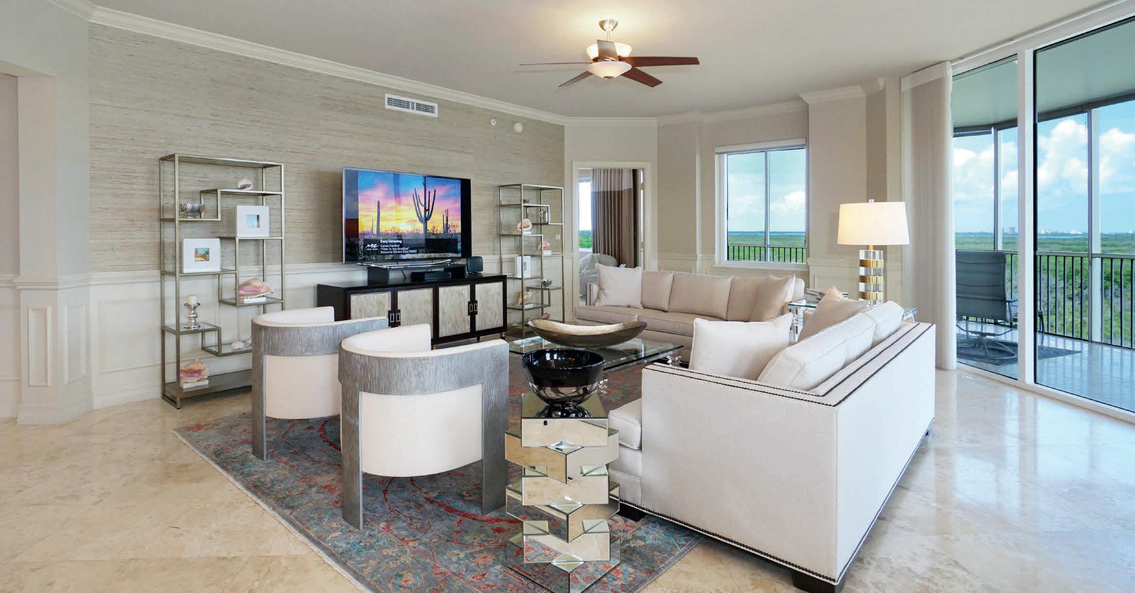 Enter this residence through the elevator opening to your private foyer. Step into a Chef’s kitchen designed to elevate your senses. Completely redesigned with an island & eating area like no other condo offers. New Jenn Air appliances, quartz countertops, and complete custom wood cabinetry. 24x24 porcelain tile floors in living areas & carpet in all suites.