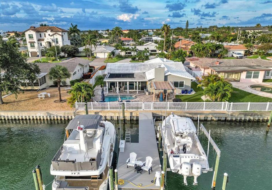 Outside you’ll find a boating enthusiasts paradise with private dock with 8,000lb lift on a 90ft seawall which allows for up to a 48 ft yacht. A rear lanai with outdoor fireplace is the perfect spot to relax and overlook the 2 piers and a tiki hut.