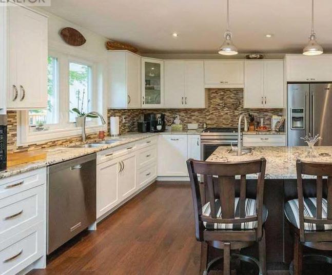 Large principal rooms include a timeless chef’s kitchen with doublestacked cabinets offering ample storage, featuring quartz countertops & backsplash, as well as an oversized multipurpose waterfall island with seating for 5. The king-sized primary suite reveals a cathedral ceiling, 2 large double closets and a 4-piece ensuite. A long interlock driveway leads to the pool-sized backyard oasis that showcases a storage shed, and a multi-level cedar deck with a solar-lit pergola that is perfect for entertaining.