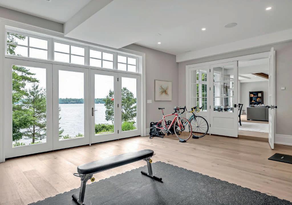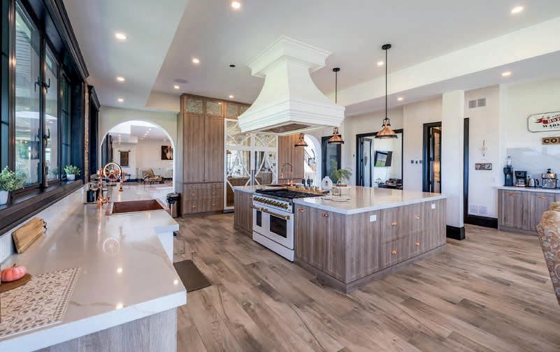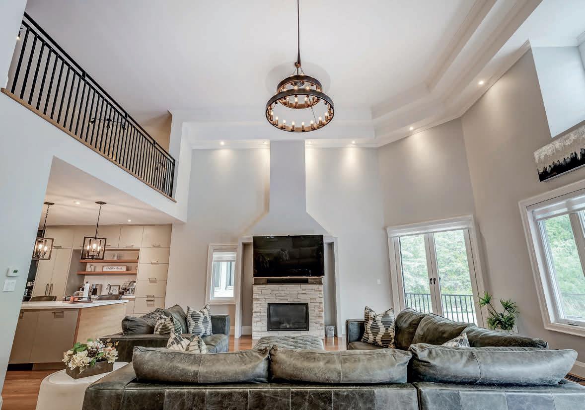 The spacious great room is perfect for gatherings, with remarkably high ceilings and a fireplace with an immaculate design. Tall windows fill the extravagant space with natural light, extending to the adjacent executive chef’s kitchen.