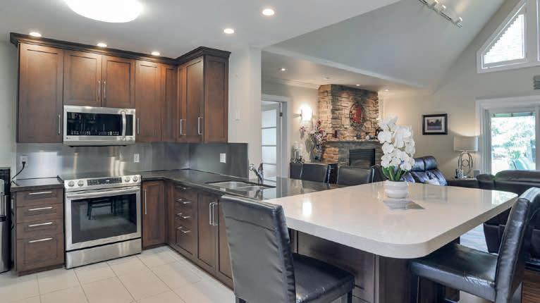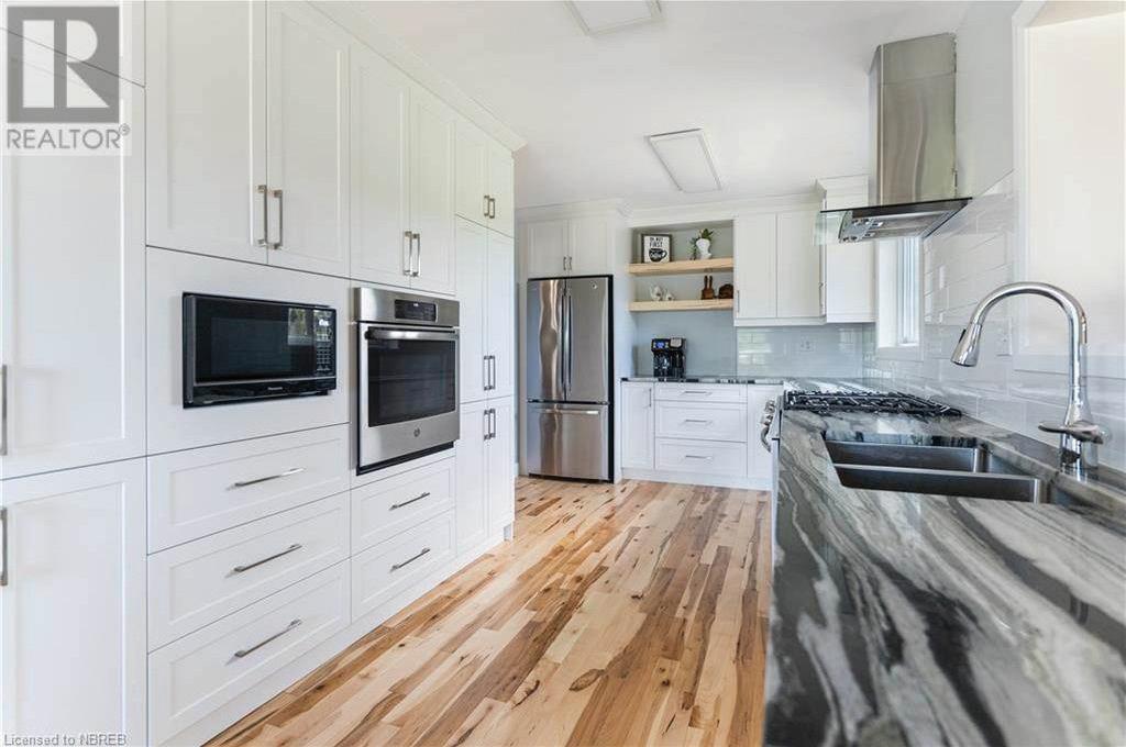 This expansive waterfront oasis offers unlimited potential as a family home, a homebased business, or as a multi-suite rental property*. You won’t need a cottage and you can enjoy both sunrises and sunsets from this property!. Across the street there is an insulated concrete boathouse, cut into the cliff, which belongs in a Bond movie. It has an electrical sub service that will accommodate a hot tub and a roof top deck perched twenty-five feet above Lake Ontario. You can relax in front of the fire pit and enjoy the sunsets with complete privacy. In addition, this property offers a 1,750 sq ft garage/ studio with five single garage doors and one double garage door. The rear portion (1,320 sq ft) is spray foam insulated, has its own heating system, offers a 100-amp electrical sub-service, and of course has the black and white tile floor that is a must in all high-end garages. The stunning harvest kitchen offers granite counter tops and custom cabinets created by a local craftsman with natural wood from the Jatoba engineered hardwood floors to the ash and mahogany cabinets.
