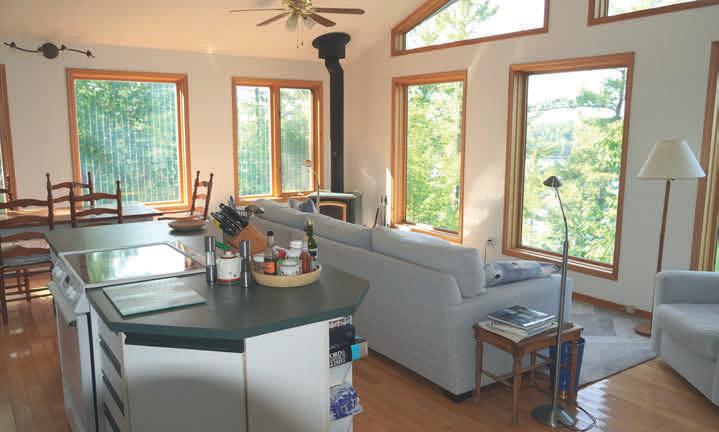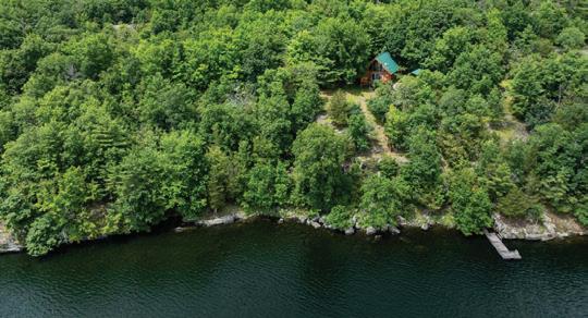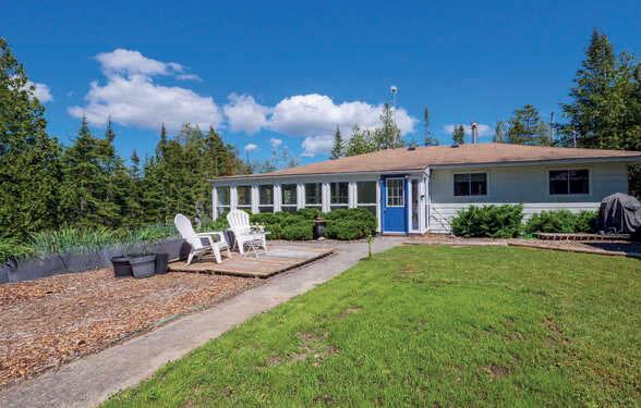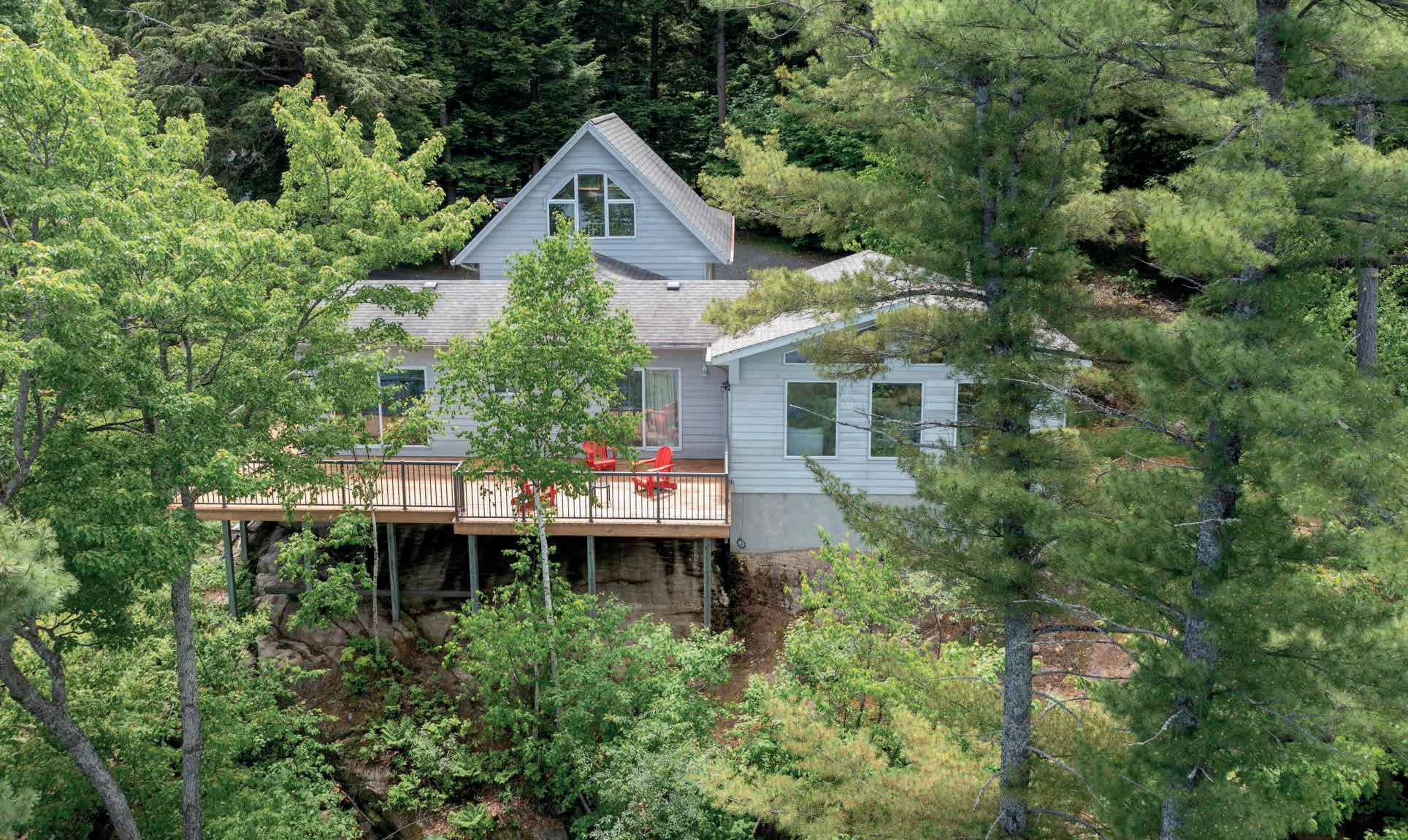 Nestled atop a 100-foot rock cliff sits the majestic cottage and bunk house, designed and built for large family gatherings. The views of the channel below are unparalleled with north-east facing vistas. The main house features 2613 sq ft of open concept living area with a large kitchen, living room with wood burning fireplace and a dining area large enough for the whole family. The main house also includes two large bathrooms, one bedroom, as well as the library and media room off the living room, and the 676 sq ft screened in porch and outdoor kitchen.