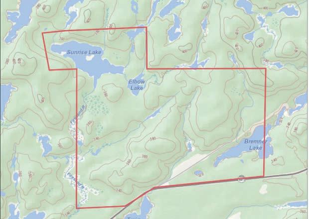 There are 3 very nice lakes within or mostly in this property. Most of Bremner Lake is in the property and a small lake just west of Bremner Lake. All of Elbow Lake is within the property. All of Sunrise Lake is within the property. These are all good fishing lakes that offer a variety of fish opportunities.