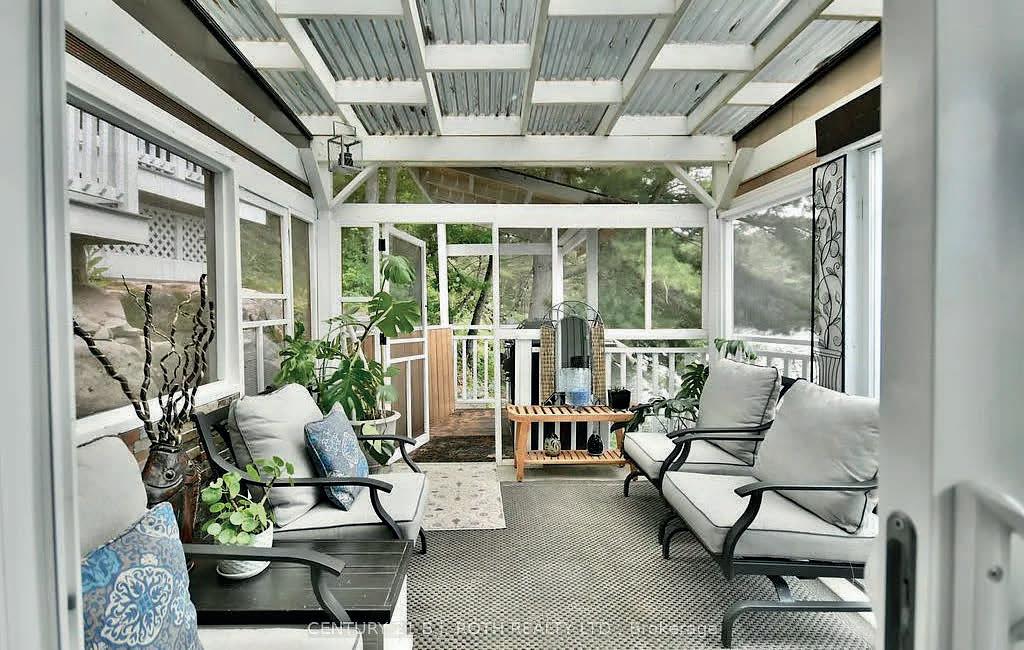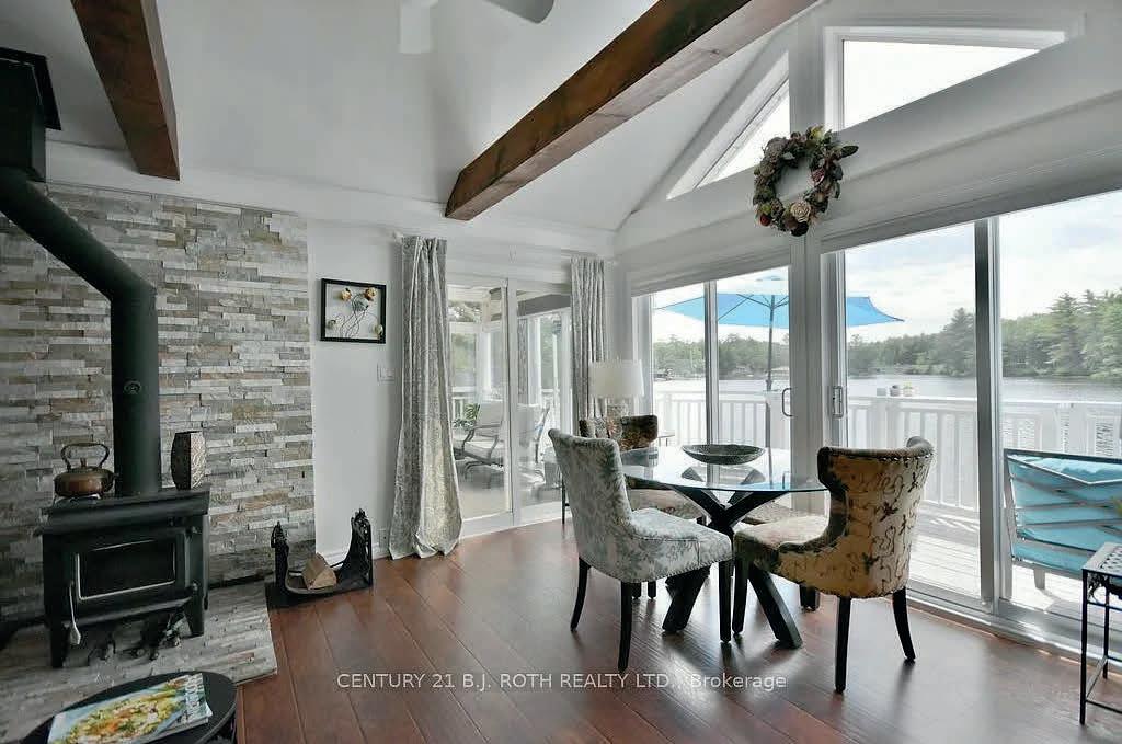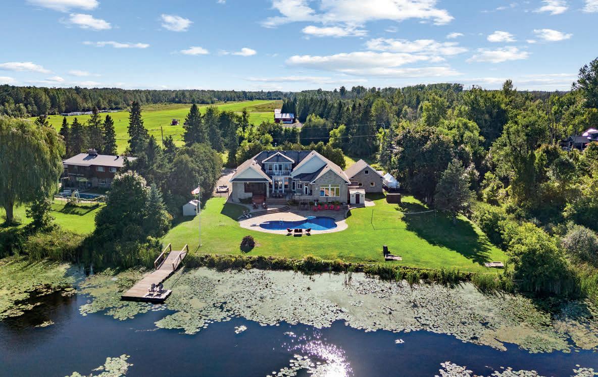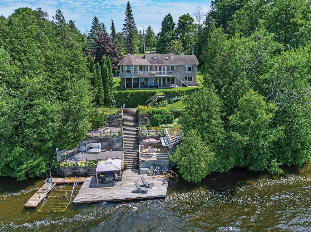 Nestled along the picturesque shores of Dog Lake, welcome to a magnificent waterfront offering unparalleled views and luxurious living on a grand scale. This beautiful home presents a rare opportunity to indulge in waterfront living at its finest, boasting a breathtaking 180-degree panorama overlooking the glistening expanse of Dog Lake. Immerse yourself in the serenity of nature as you explore this exclusive estate, featuring an impressive 1039 feet of pristine shoreline that ensures privacy and seclusion, allowing you to embrace the peaceful beauty of the surroundings. Spanning across 4 meticulously landscaped acres, this remarkable property epitomizes elegance and sophistication, with a design that seamlessly blends indoor luxury with outdoor splendor, creating a harmonious retreat for both relaxation and entertainment. Step inside and experience the art of fine living in a home that has been completely and professionally renovated to perfection. The heart of the home is highlighted by a see-thru fireplace that unites the great room and dining room, creating a warm and inviting ambiance that is perfect for intimate gatherings and cozy evenings by the fire. Elevating the grandeur of the residence is the 2-storey great room with soaring ceilings with several skylights to add an abundance of natural light. Upstairs, a second-storey loft provides a stunning vantage point to admire the mesmerizing views of the water, creating a tranquil and inspiring space to relax and unwind in the beauty of nature. Indulge in the joys of outdoor living with a 3-season sunroom, extensive decking, and a patio facing the water, offering a perfect setting to bask in the sun, entertain guests, or simply revel in the tranquility of the lakeside setting. Boasting an impeccable design and pristine condition throughout, this home features 4 bedrooms, 2 full bathrooms, and 2 half bathroom, providing ample space and comfort for the whole family.