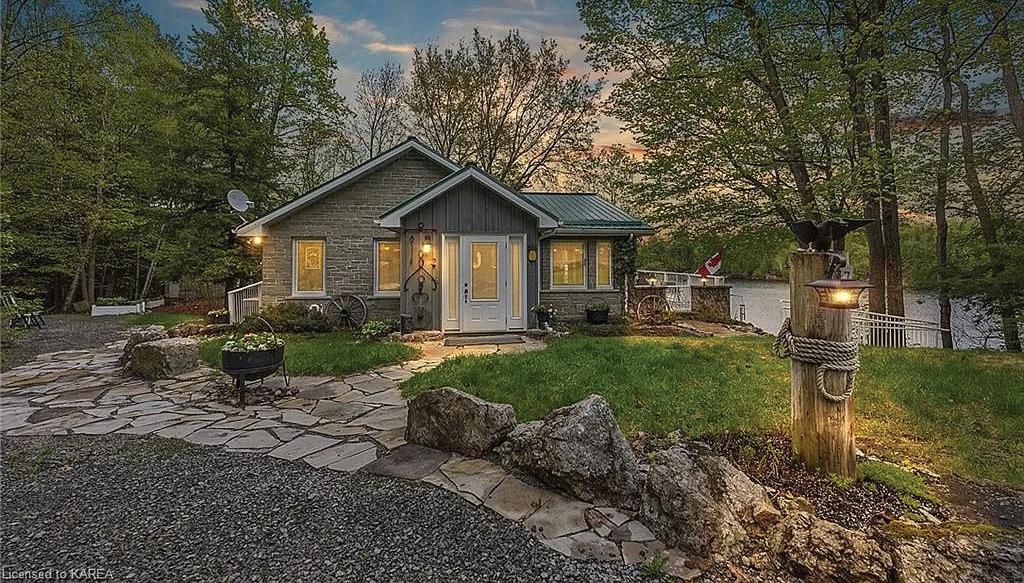 Just a short drive from downtown Kingston and a quick jaunt in to Westport, nestled among mature trees, this magical property on Buck Lake is waiting for you to call it home. From the moment you drive down the private lane, this charming waterfront home is deceiving. The main floor of this beautiful stone home boasts floor to ceiling windows and patio doors to the wrap around deck and is complimented by the open concept living room, dining room and a kitchen with dedicated prep nook that can cater to any and all gatherings. You will find one bedroom and a full bathroom with clawfoot tub to soak in after a day on the lake and access to the loft, where you can get away to read your favorite book. The lower level, which is a walk-out, has two additional bedrooms (that could easily be three), a 4 piece bathroom, laundry closet, cozy rec room with propane fireplace and like upstairs, floor to ceiling windows and patio doors so that you never lose the view. You walk out into a three season space under the deck, where you'll spend many nights playing cards/games. Just a few steps from the main house, your guests will enjoy their own space, complete with a single/ double bunkbed, toilet, sink and their own outdoor shower. Take the stone steps down to the lake, pop open the cabana and host the best dock party around! There is plenty of room on the dock for all sorts of activities and the boat house is ready and waiting to house your watercraft of choice. *Includes Year-round living, Brand new KohlerGenerator, and Fully Winterized Bunkhouse Cabin.