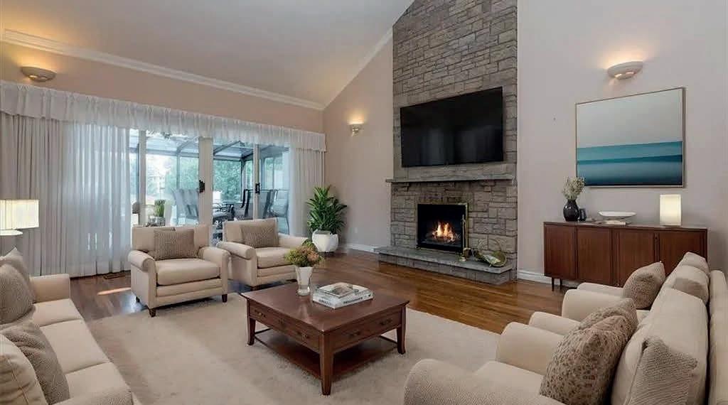 Welcome to 7 MacIntosh Road, a luxurious 3,800 sq ft home fully renovated in 2017. It features a stunning stone and hardie board exterior and elegant interiors with wide plank oak hardwood floors, porcelain, and ceramic tiles. The chef’s kitchen includes quartz countertops, custom cabinetry, a Wolf 6-burner gas range, and a Sharp microwave drawer. The living room has vaulted ceilings, natural light, and a gas fireplace. With a sunroom with panoramic views, a home theater, gym, premium generator and security system, this lakefront property also offers a sandy beach and a beautiful patio. Contact for a private viewing.