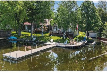 Introducing “Anchor Villa,” a spectacular waterfront home steeped in Georgian Bay history, awaiting the perfect family to create cherished memories. Set on a sprawling 0.67-acre plot, in an exclusive neighbourhood of Thunder Beach , this property was once part of a thriving hotel in the 1940s, offering a unique slice of heritage for the lucky residents. Embrace the nostalgia of the past while enjoying modern living in this six-bedroom, fourbathroom year-round home. Step into the open-concept living space, where the former main dining lounge now offers a charming great room, complete with intricate architectural details and a walkout to a waterside wraparound and tiered deck. The majestic stone fireplace extends throughout all three levels, providing a cozy ambiance. With breathtaking views of the bay from each floor, there’s plenty of space for family and guests to relax and unwind.