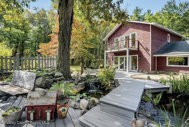 Timeless and beautiful, completely private Arts & Crafts Contemporary with sweeping Hudson River-and-beyond views, only minutes from the Mid-Hudson Bridge. Impeccably designed with the views in mind, this home combines an open layout and substantial style. From the breakfast nook and chef’s kitchen to the screenedin porch and deck to the fireplace, a large primary suite with a private deck, a writer’s room, (also with views, of course), a soaking tub, and radiant heat on all floors, to the finished walkout-basement with overflow guest rooms, this home offers everything and more, including a separate two-car garage with heated studio above, ideal for yoga, meditation, painting, or crafts. And yes, the chicken coop has views as well. Solar panels for energy savings and a whole-house generator for peace of mind complete the picture. The home is only minutes from Red Maple Vineyard, the Cellars, and the Hudson House. About 15 minutes to the Thruway, and the Poughkeepsie Train Station.