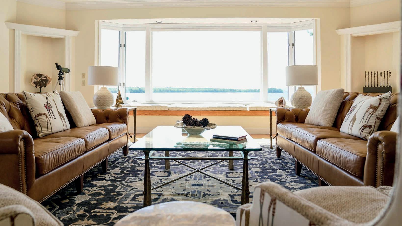 The living room beckons with its high ceilings, wood burning fireplace, and a decorative bay window that allows for plenty of natural light and a seasonal river view.