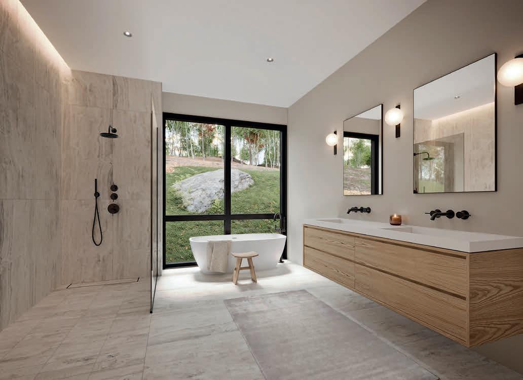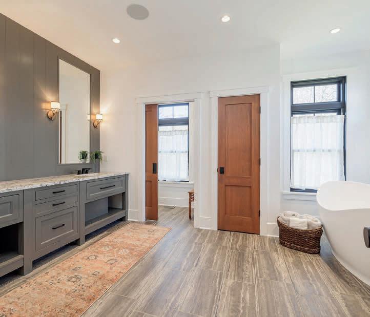 With a focus on seamless first floor living, the Primary wing provides a destination of privacy and peace. Adjoining sunroom, yoga studio/den or office, dual walk in closets, steam shower and Japanese inspired Soaking Tub with elements of wood, stone and natural light.
