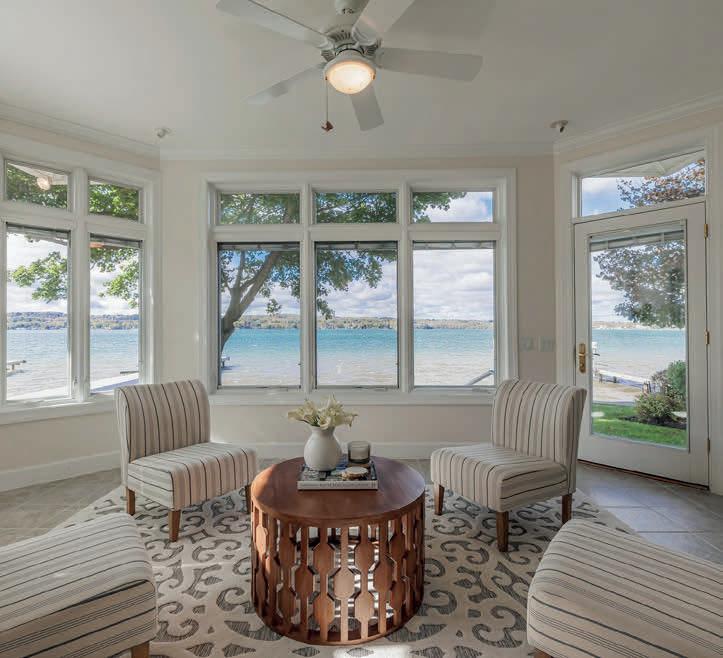 abundance of cabinetry, quartz counters, and a breakfast bar with adjoining dining space! The gathering room offers timeless custom built-ins and flows seamlessly into the yearround sunroom ideal for enjoying morning coffee or evening cocktails! The first-floor primary suite has an en-suite and convenient adjoining laundry, ensuring effortless “no-step” first-floor living. A second-floor loft, two large lake-facing bedrooms, full bath and flex space for exercise, game room, or future bedroom! Walk to Restaurants, CMAC, Lakeshore and experience all that the Finger Lakes have to offer!