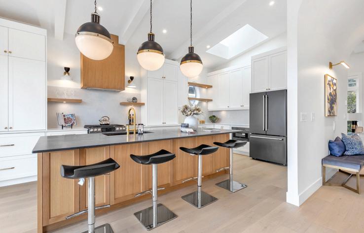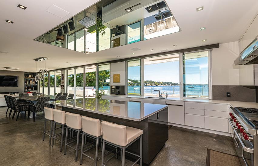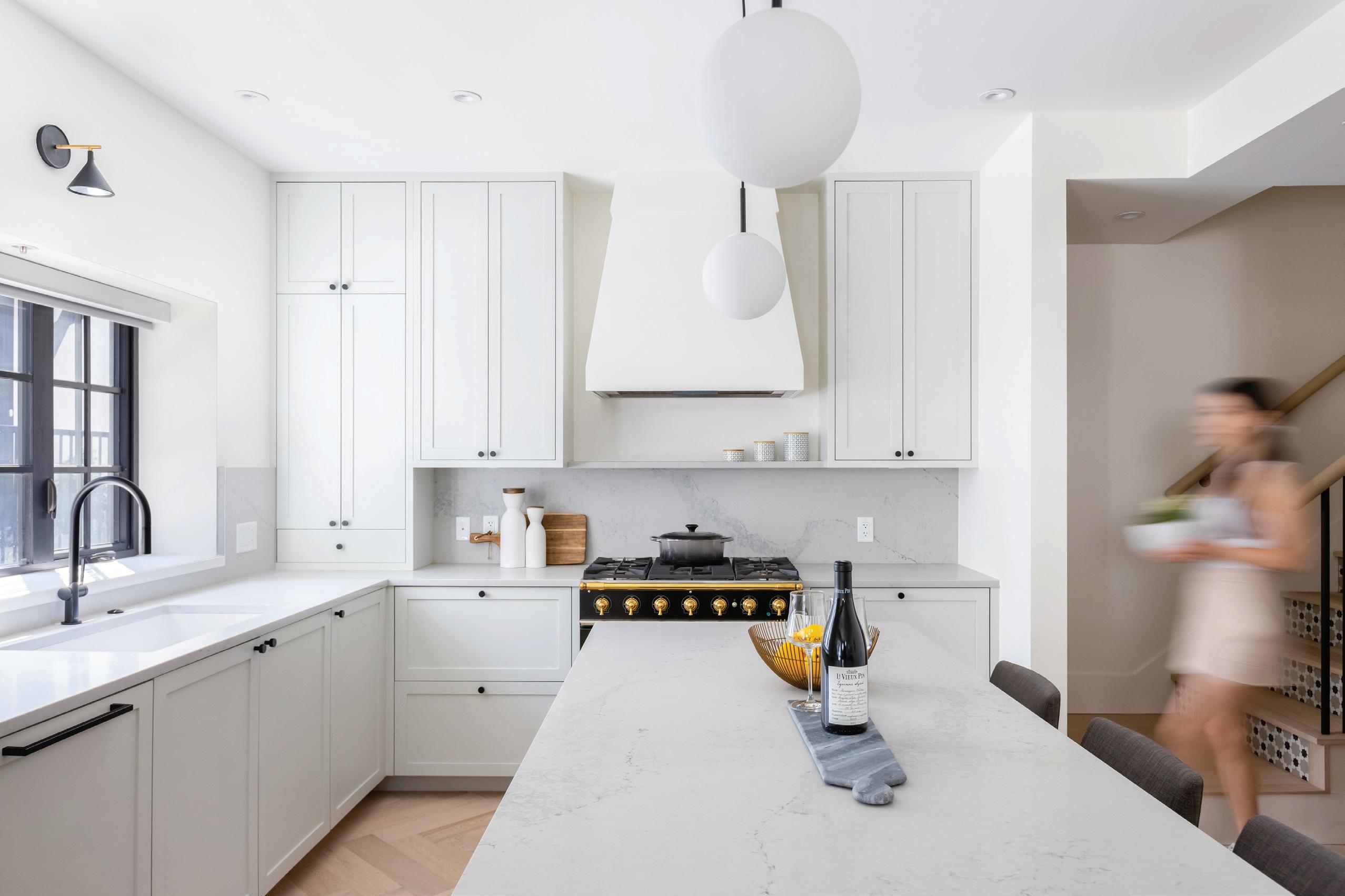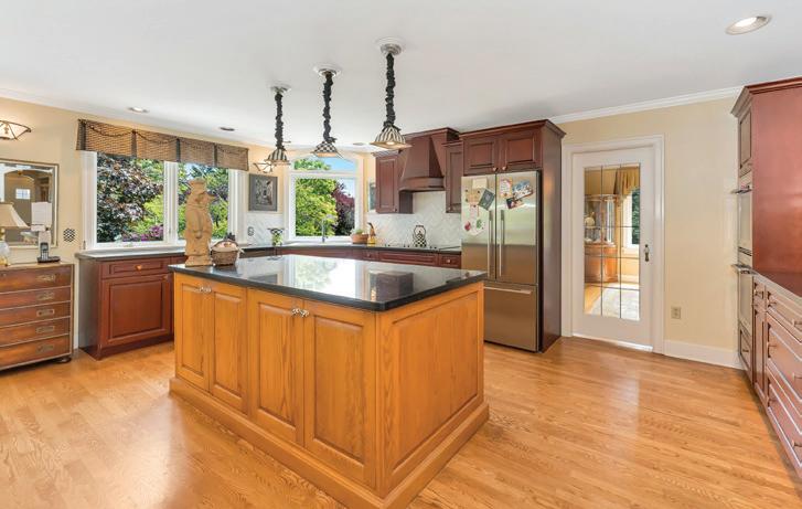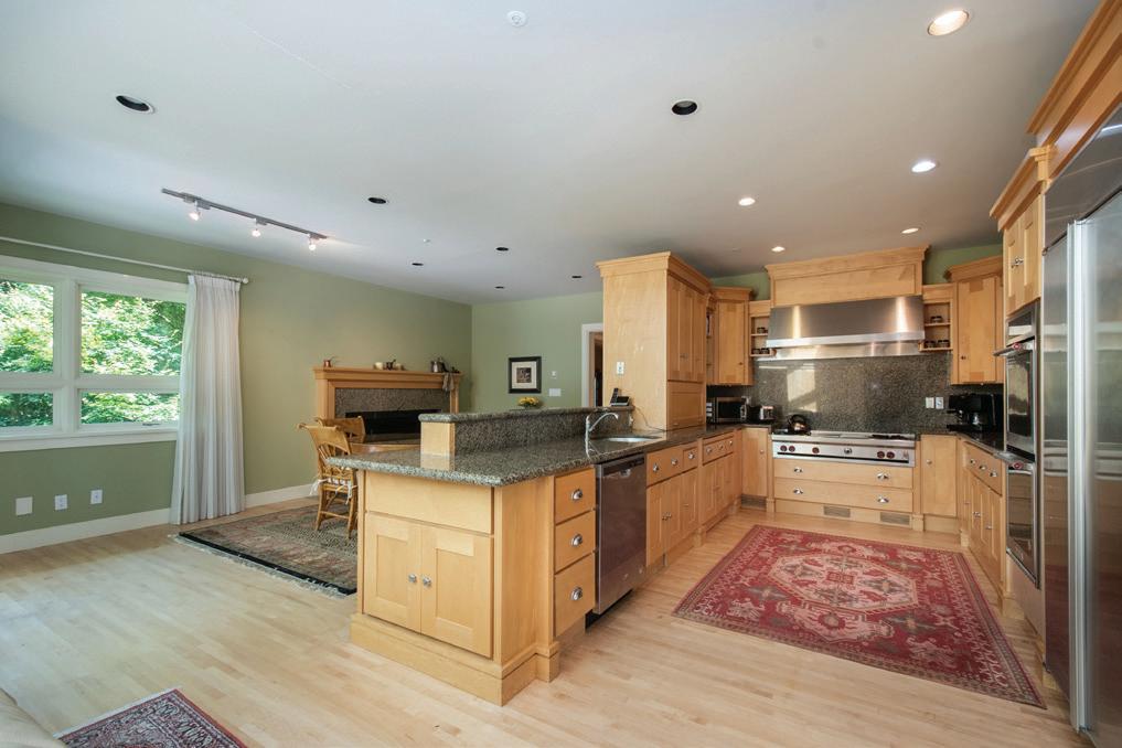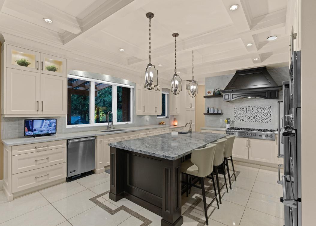 An exquisite kitchen with a 36” Cornufe La Cornue gas stove, Miele integrated french door fridge & a huge kitchen island. is home o ers custom features for ease & comfort including roughed-in security,