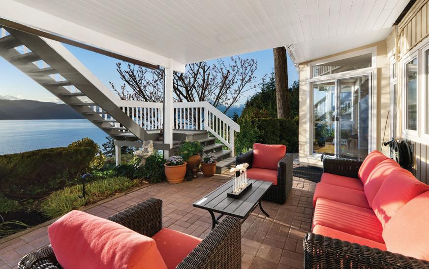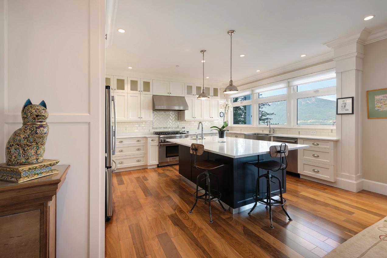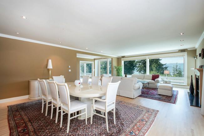 The understated elegance of this property is evident as you approach. The gate opens to welcome you, the driveway gently curves towards a double garage, and a stone walk leads you around a garden to the barrel-vault portico at the entrance. Inside, the two-storey foyer showcases attention to detail with crown mouldings, wainscoting. Hardwood floors and marble tile floors all feature in-floor heating on the main floor and bathroom floors are heated upstairs. Double French doors in the dining area and living room lead to the wraparound deck. Spectacular views of the North Shore and Vancouver skyline across Queen Charlotte Channel are shared with the recently upgraded kitchen. With a level entry, the main floor also offers an ensuite bedroom, separate office, powder room, laundry, and garage access, lending itself to one-level living. An additional three bedrooms and two baths upstairs make it perfect for a family as well, with a large flex room on the upper floor serving as a fifth bedroom, children’s playroom, or home gym. This home’s design blends understated luxury with function, comfort, and beauty. Both elegant and practical, it caters to a variety of lifestyles, whether you’re seeking the ease of single level living or room for a growing family, all set against an incredible backdrop of natural beauty.