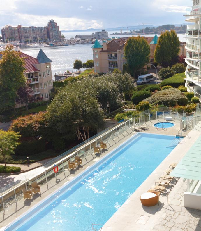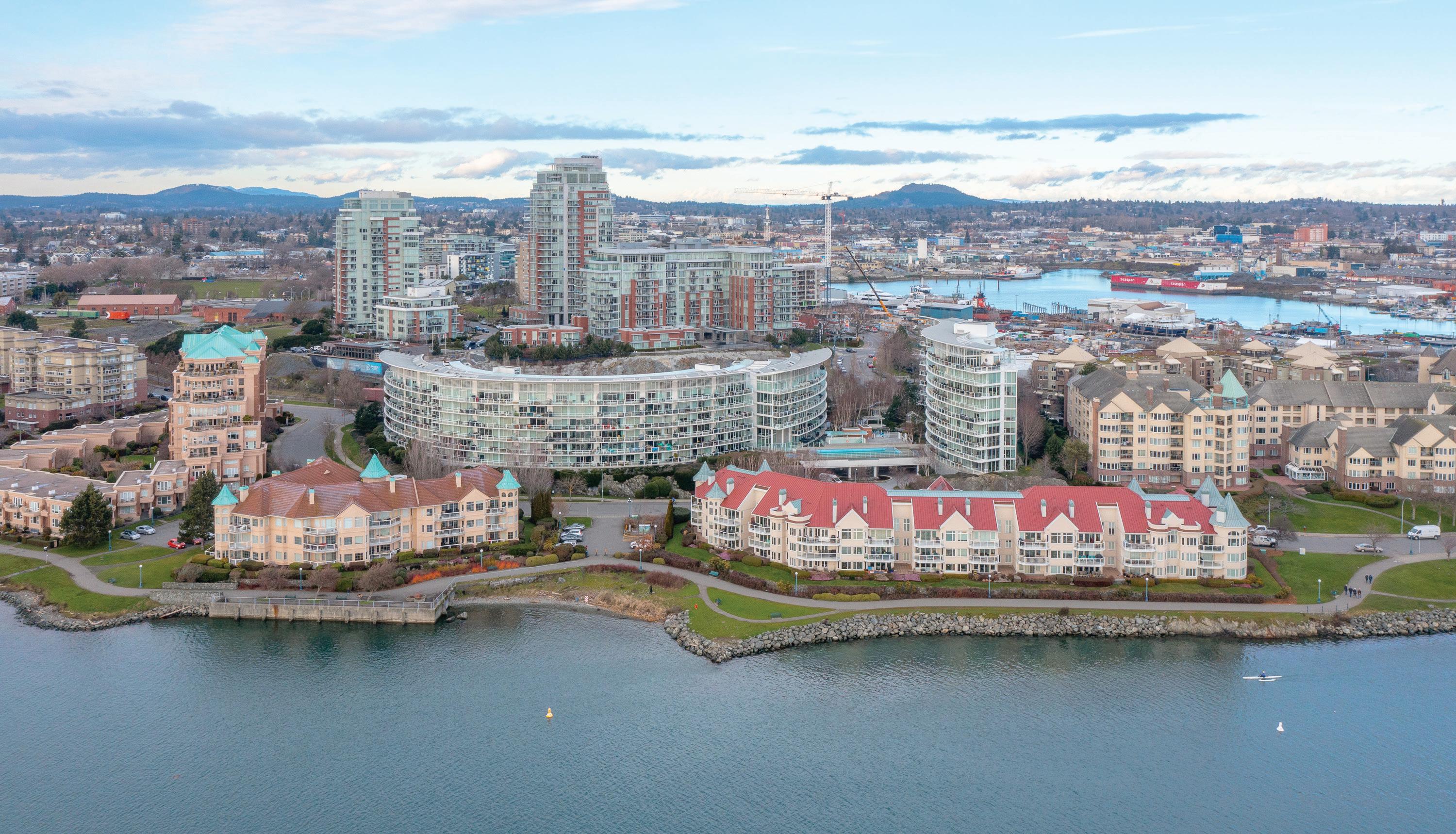 Doesn't get better than this! 8th floor suite with amazing Harbour, City, Ocean & Mountain views is a rare commodity. A 1 bedroom+den with 1.5 baths,1 owner, well cared for, open kitchen, some new appl., newer solid hardwood through main areas, marble countertops, floor-to-ceiling picture windows plus a enormous balcony for outdoor lounging and entertaining, all with gorgeous views of the outer harbour & mountains. This complex features a 75' infinity lap pool, 2 hot tubs, sauna, steam room, fitness centre, common area lounge, business conference room + guest suite. All this set on a 3-acre property surrounded by beautiful water gardens, with mature shrubbery and gorgeous waterfall driveway entry. Mins to walk/bike and enjoy Victoria's vibrant waterfront community, yacht marina, restaurants and more. Take the short stroll into Downtown or ride the Galloping Goose Trail out to other communities. Separate storage and u/g secure parking included.