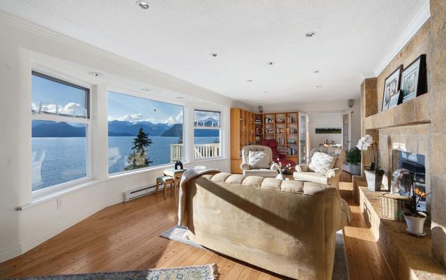Stunning, uninterrupted views of beautiful Howe Sound surround you at every level of this meticulous, welcoming home. Tucked into a private setting, with manicured outdoor spaces, this home has been lovingly maintained by its long time owner. Elegant foyer, huge living room/ gas fireplace, dining room & deck on main. Upstairs find a peaceful Primary bedroom with cozy fireplace, freestanding tub & view deck to enjoy those amazing sunsets+ second bedroom & large office. Lower level offers generous rec. room, huge fireplace, Bedroom, Den, sauna & amazing flex space surrounded by windows. This level has welcomed many visiting family members over the years & can be teenage space or completely self contained. Separate, legal, one bedroom, suite with views, W/ D & gas FP. A very special offering!