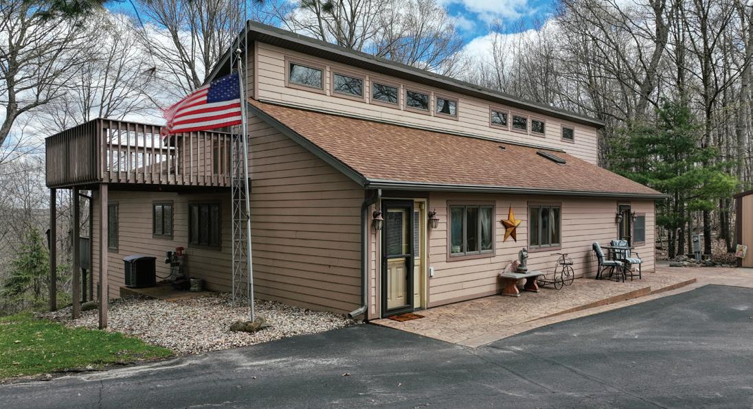 Huge, 3 bedroom, Reminiscent of Frank Lylod Wright architecture. 3 1/2 bathroom Ranch home on a whopping 110, amazingly wooded acres! Kitchen and all bathrooms remodeled 2021/2022. Spacious cabinets and countertops, with bright, beautiful, subway tile backsplash and floating shelves. All brand new appliances included! Seeded glass pendants and custom lighting through-out. Dedicated laundry room, with herringbone tile, on the main level, with tons of additional cabinetry. Exposed brick fireplace in dining room, also featuring sliding doors to a brand new, wrap-around deck. Atrium has a convenient wet bar, sky light, and also has sliding door with deck access. Another custom rock fireplace warms the Livingroom, boasting unique arches, stucco, exposed beams and vaulted ceilings. ,All new, solid wood, Alder doors. The main bedroom, with it’s own slider to deck access, also has a renovated en-suite bathroom with stunning tile flooring and shower surround. Next door is another remodeled bathroom with vessel sink and additional, plumbed space for another washer and dryer if wanted. On the lower level is a huge, walkout family room with yet another, custom rock, wood- burning fireplace, and sliding door access to the patio, with spectacular views of the backyard and pond. Tons of extra storage space here too. Sauna included! In addition to the 2 car attached garage is a second garage with an oversized door big enough for RV or boat storage. Storm shelter also. New roof. 2 LP tanks included (1000 & 500 Gallon) New: 2 furnaces, 2 hot water heaters and water softener system! Bonus: 2nd home with garage included on this property, needs a little TLC.