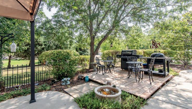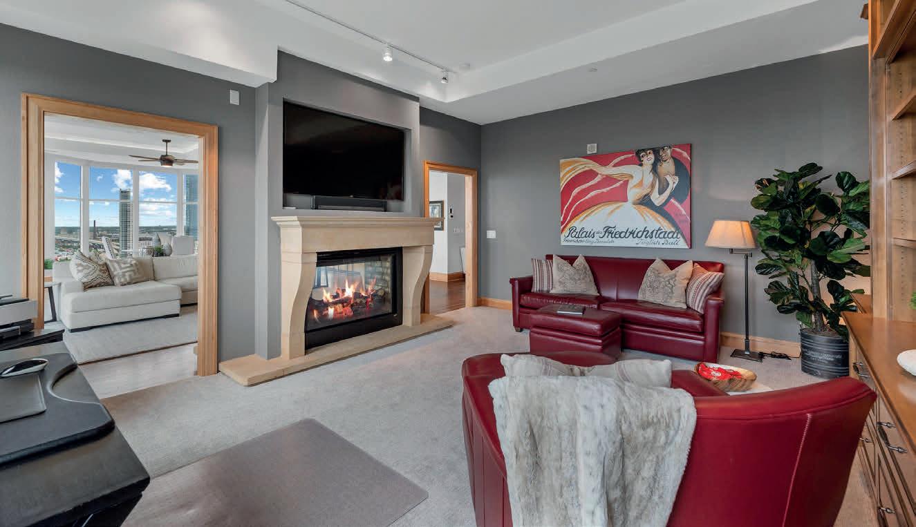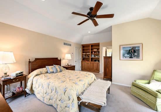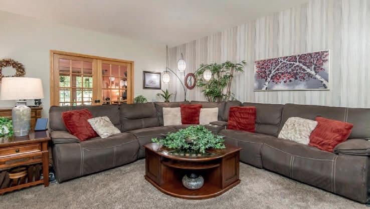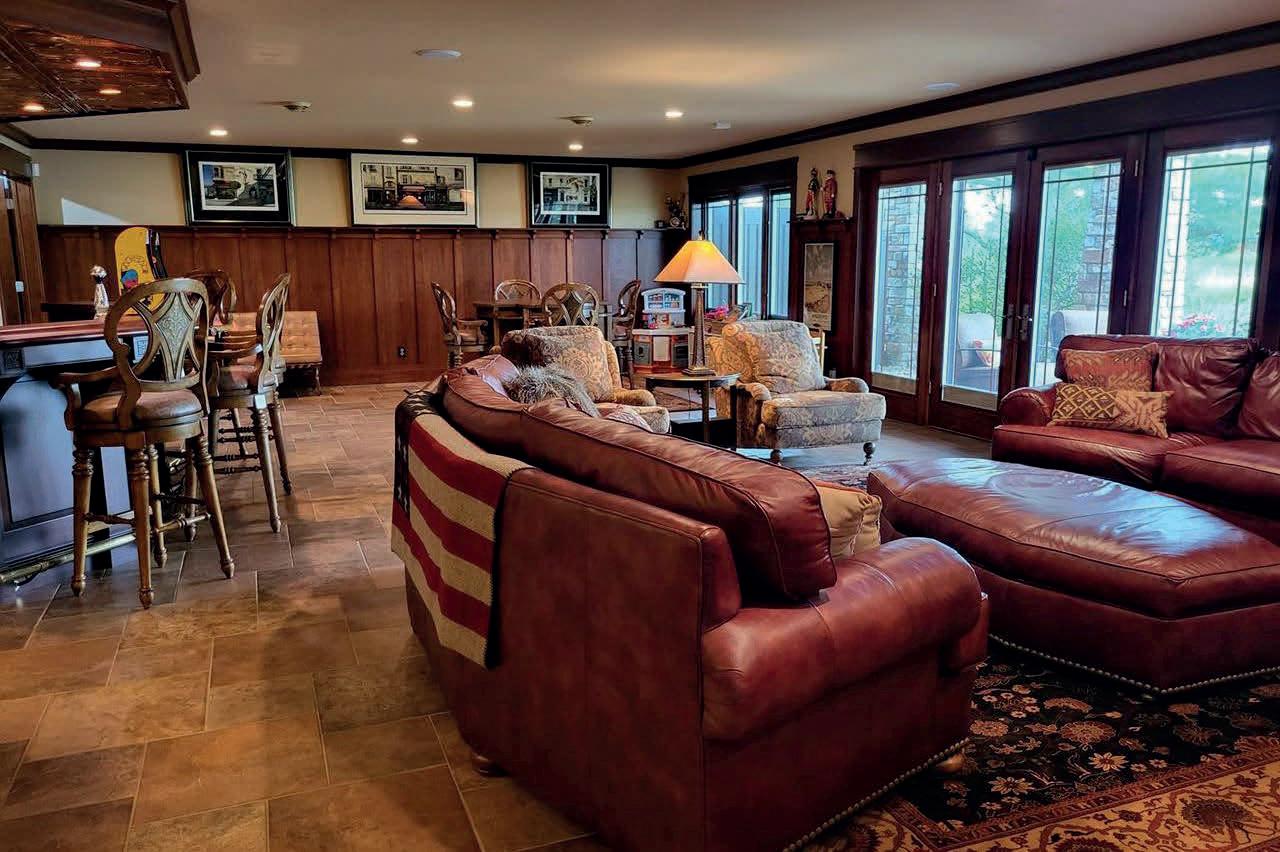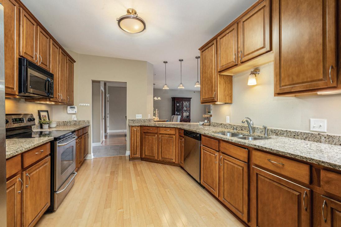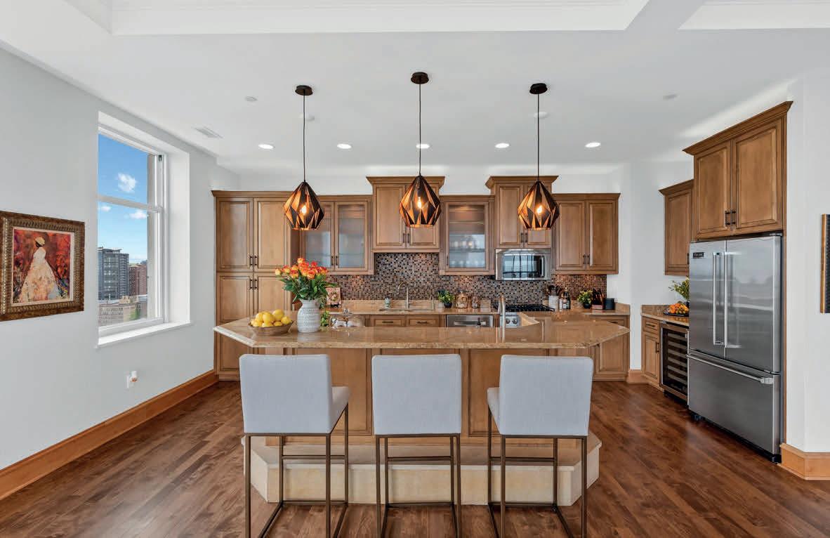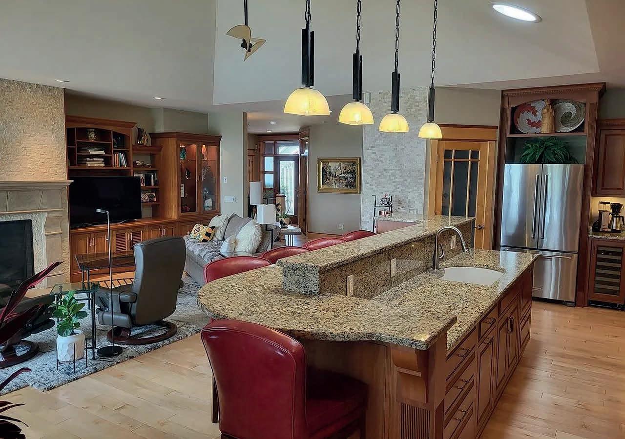 This executive condo, crafted by Trudeau Construction, offers a blend of luxury and custom design. The Featherstone cherry kitchen stands out with its granite countertops, marble backsplash, walk-in pantry, and center island. The open-concept living area features a gas fireplace, built-ins, vaulted ceiling, and 3/4” maple wood floors throughout the main level. The foyer, with its leaded glass front door and white marble facade, sets the tone for the home, featuring artistic stone inlays and designer sconces. The main floor includes a formal dining room with a lighted tray ceiling, an office, a guest bedroom, and a full bath.